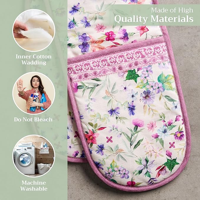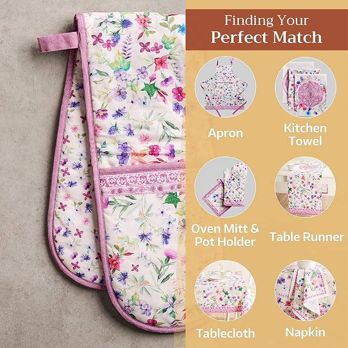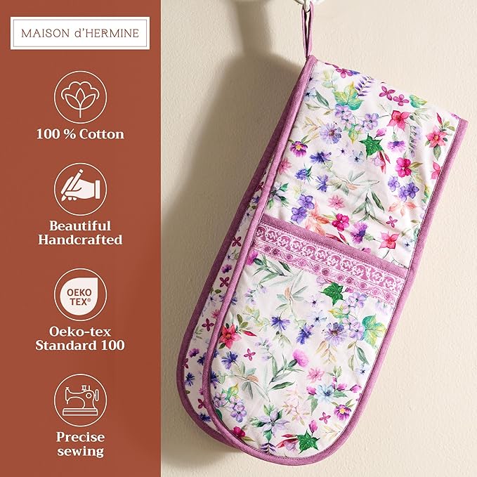 Maison d' Hermine Double Oven Mitts 100% Cotton 7"x35" Double Oven Mitt Heat Resistant BBQ Cooking Gloves with Loop, Baking, Grilling, Home, Kitchen, Handling Hot Pans Spring Summer (Chardon)