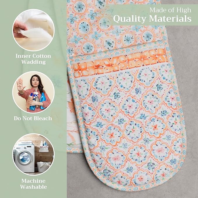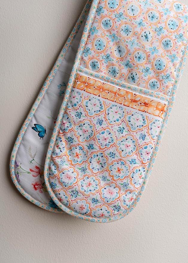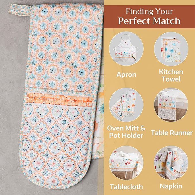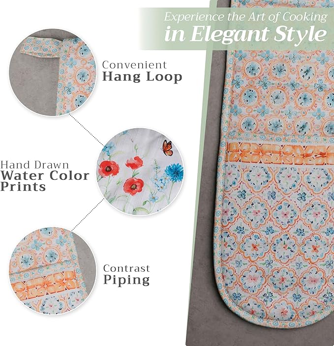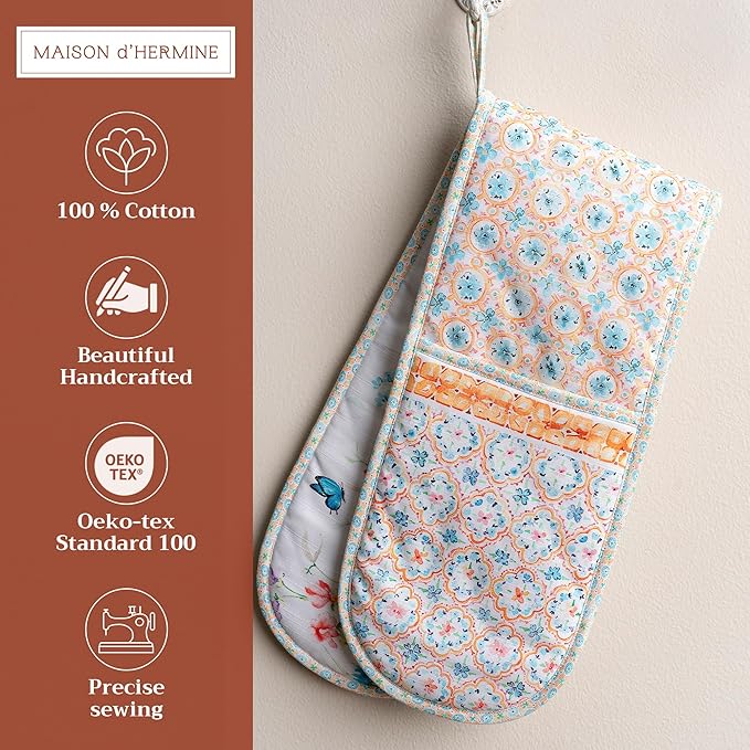 Maison d' Hermine Double Oven Mitts 100% Cotton 7"x35" Double Oven Mitt Heat Resistant BBQ Cooking Gloves with Loop, Baking, Grilling, Home, Kitchen, Handling Hot Pans Spring Summer (Summer Whisper)
