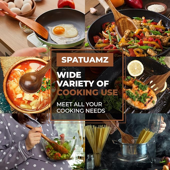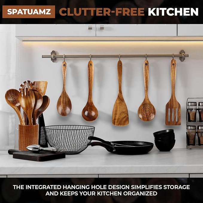 SPATUAMZ Teak Wood Spoons for Cooking, Natural Wooden Utensil Set of 10, Durable Heat Resistant Kitchen Cooking Utensils for Non-Stick Cookware