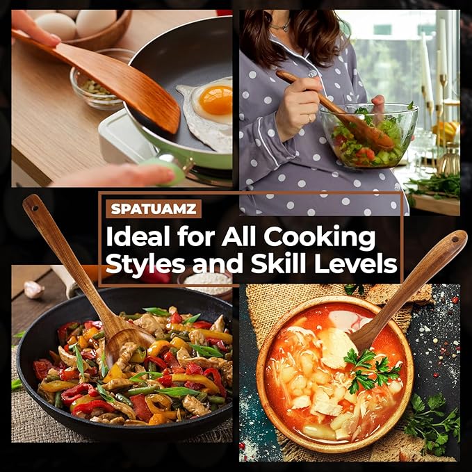 SPATUAMZ Wooden Spoons for Cooking, Teak Wood Nonstick Kitchen Utensils Set, Non-Toxic Wooden Spatula Set of 9 for Any Kitchen