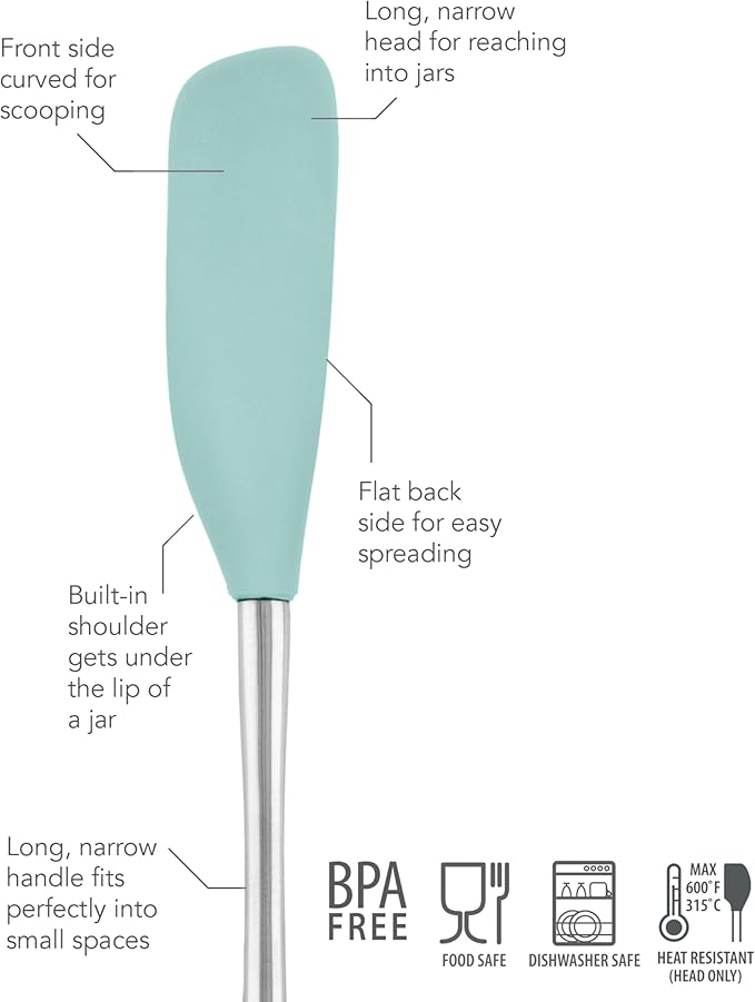 Tovolo Jar Spatula Silicone Long Stainless Steel Handle Spatula Aqua Seafoam Green, Jar Scraper Heat Resistant Dishwasher Safe BPA Free Kitchen Utensil for Scraping Spreading Jelly Peanut Butter