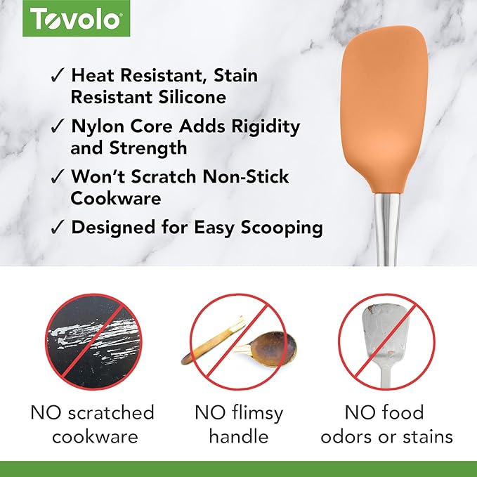 Tovolo Spoon Spatula Spoonula with Stainless Steel Handle Ergonomic Grip Apricot Orange, Silicone Scoopula Kitchen Utensil Non Scratch Easy Clean Dishwasher Safe Heat Resistant Scoop Spatula