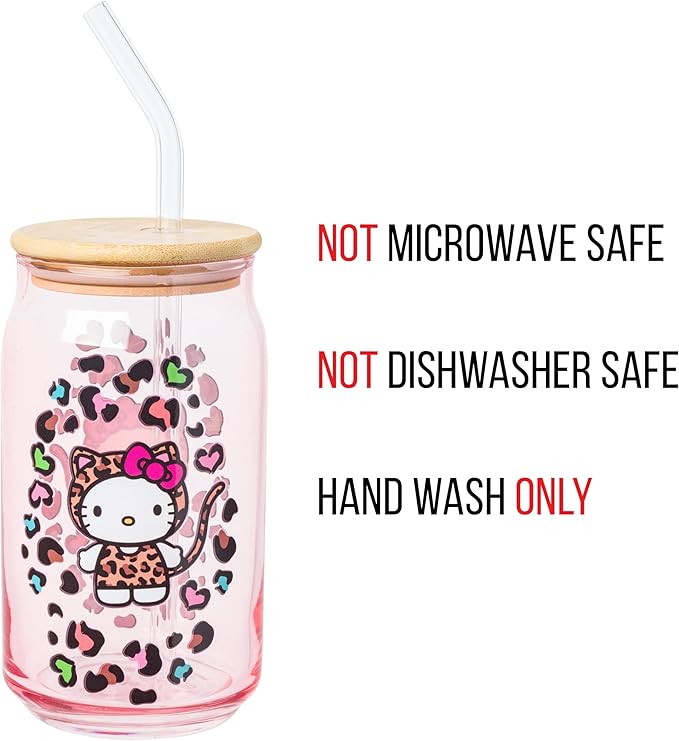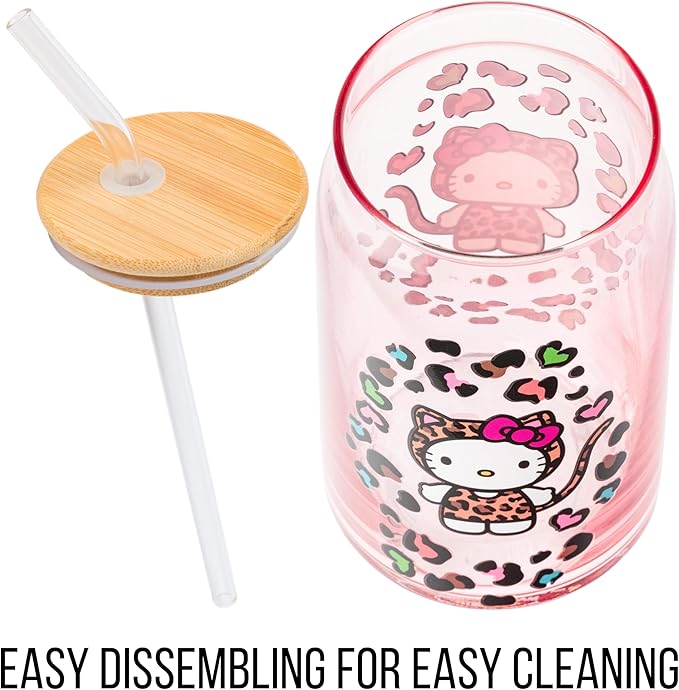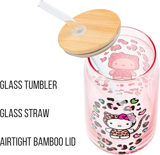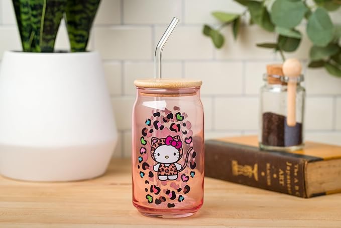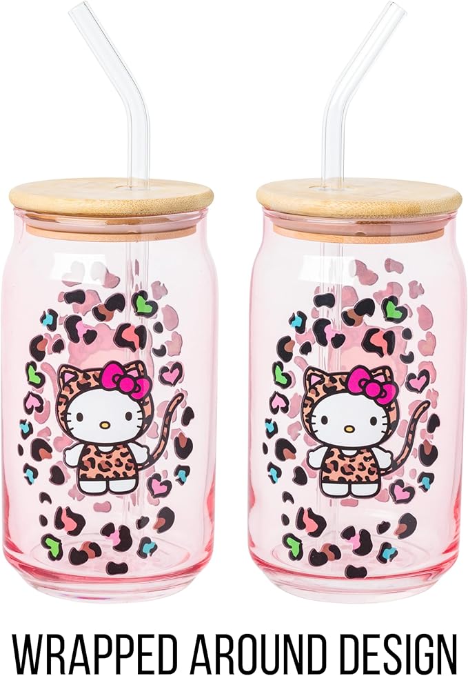Silver Buffalo Sanrio Hello Kitty in Leopard Print Outfit and Leopard Cat Print Pattern Pink Glass Jar Tumbler with Bamboo Lid and Glass Straw, 16 Ounces
