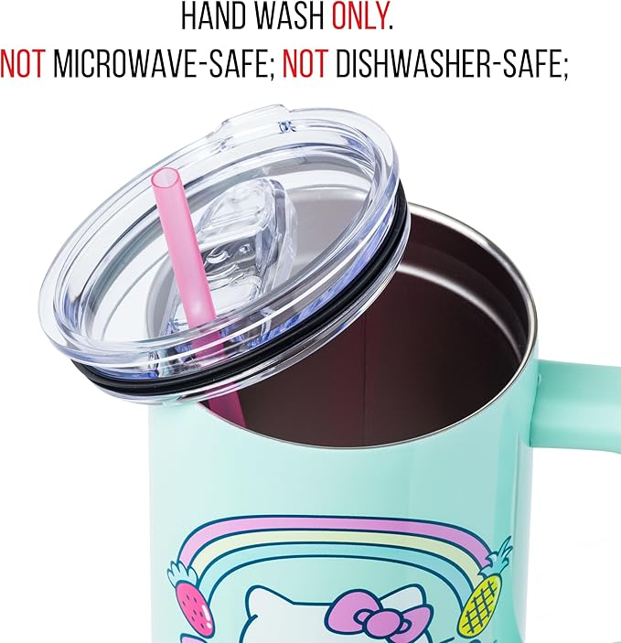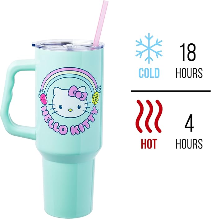 Silver Buffalo Sanrio Hello Kitty Kawaii Strawberry, Pineapple, and Rainbows Stainless Steel Tumbler with Handle and Straw, Fits in Standard Cup Holder, 40 Ounces