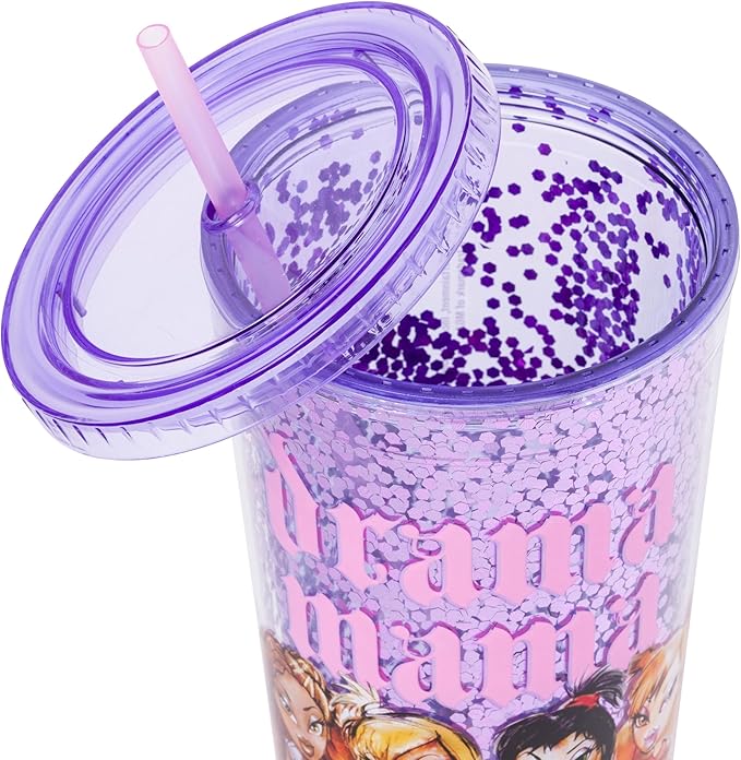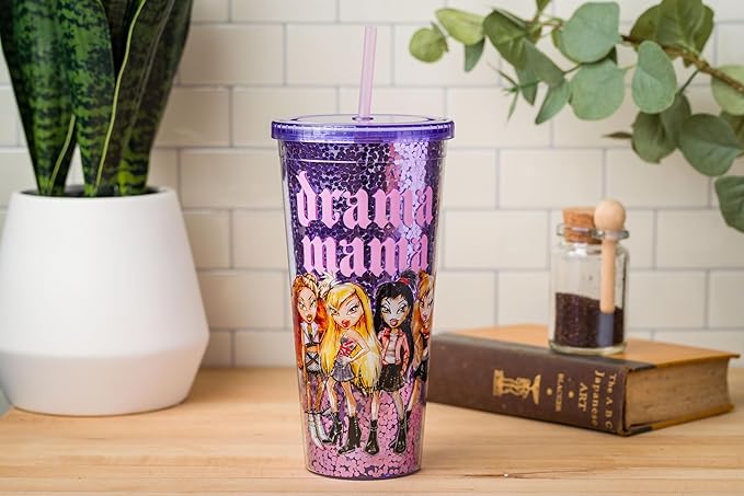 Silver Buffalo Bratz Drama Mama Featuring Cloe, Yasmin, Jade, and Sasha Plastic Confetti Cold Cup with Lid and Straw, 32 Ounces