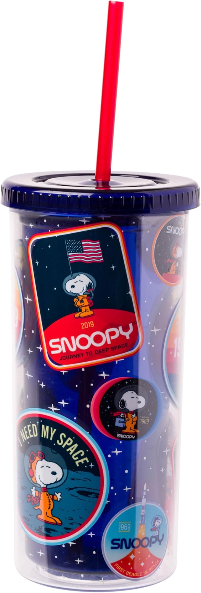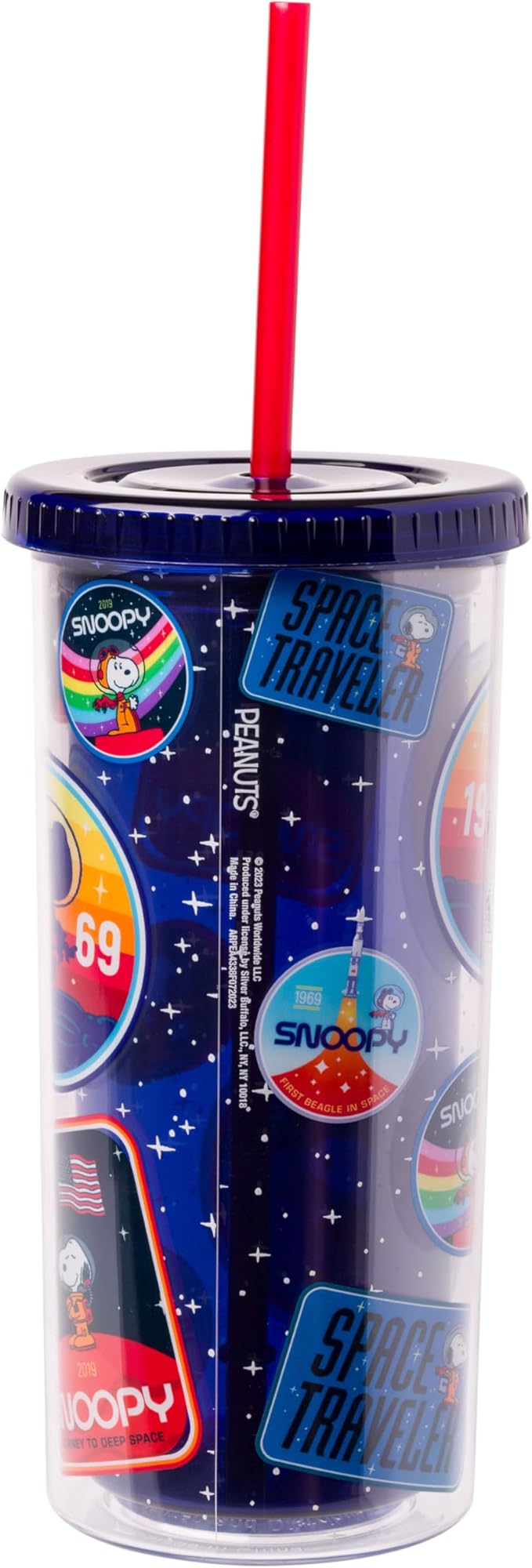 Silver Buffalo Peanuts Space Traveling Patches Featuing Snoopy Plastic Tall Cold Cup with Lid and Straw, 20 Ounces