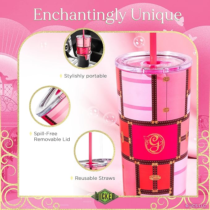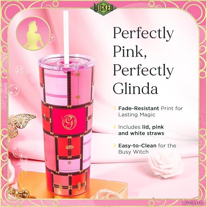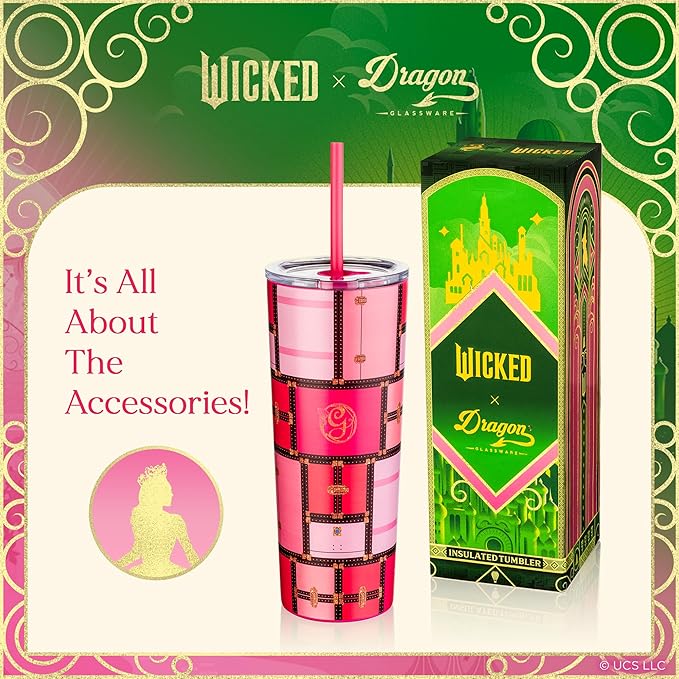 Dragon Glassware x WICKED Vacuum Insulated Tumbler with Lid and Straw - 24 oz Tumbler Cup with 2 Straws - Stainless Steel Tumbler with Straw for Water, Iced Tea - Wicked Glinda Tumbler