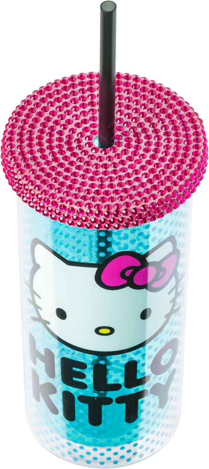 Silver Buffalo Sanrio Hello Kitty Blue Polka Dot Plastic Cold Cup with Rhinestones Lid and Straw, 20 Ounces