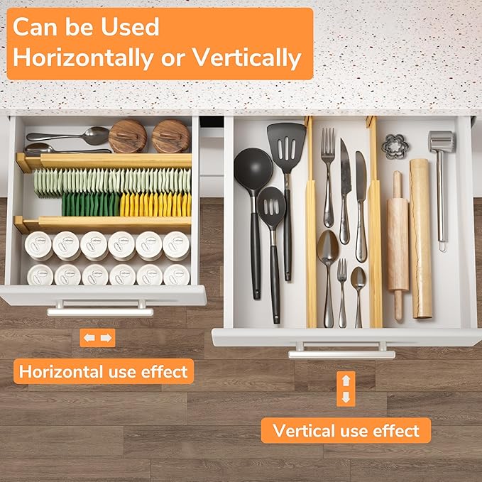 BAMEOS 4 PCS Bamboo Drawer Divider Adjustable Drawer Dividers Kitchen Drawer Organization Utensil Organizers for Kitchen Dresser Bathroom Bedroom and Office