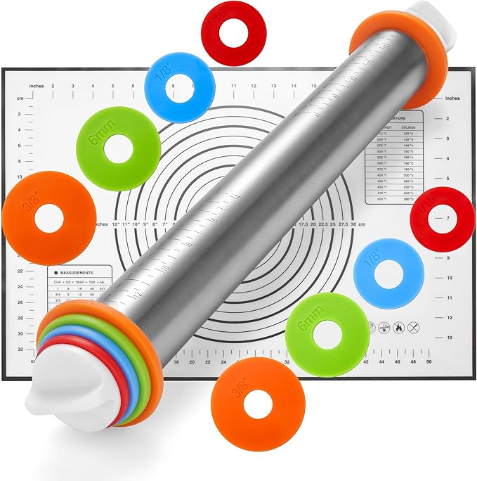 17 Inch Adjustable Stainless Steel Rolling Pin with 4 Thickness Rings & Non-Stick Pastry Mat – Professional Dough Roller for Pizza, Cookies, Pasta & Pies - Black