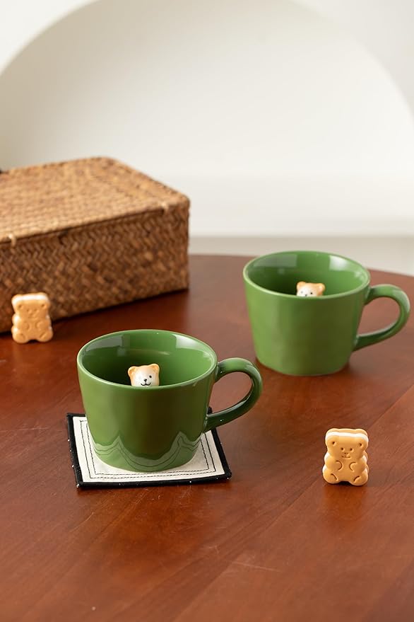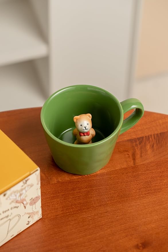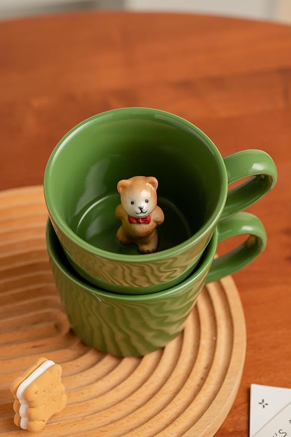DIHOclub Bow Tie Bear Coffee Cup Hidden Ceramic Animal Inside Mug,Cute Cartoon Handmade Figurine Mugs,Holiday and Birthday Gift for Coffee Milk Tea Lovers,12 Oz(Green)