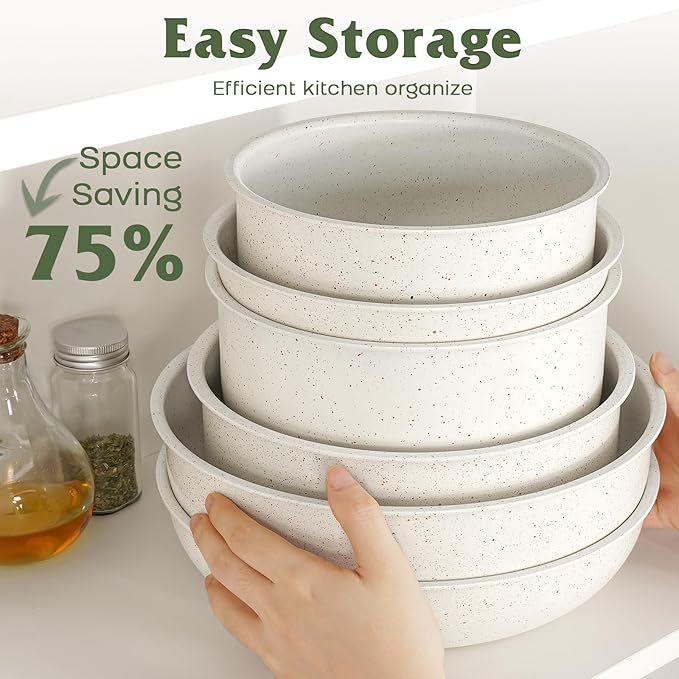 18 Pcs Pots and Pans Set Non Stick, Cookware Sets with Detachable Handle, Nonstick RV Kitchen Cooking Tools Removable Handles, Oven Safe, Induction Fast, Stackable Induction Cookware, White