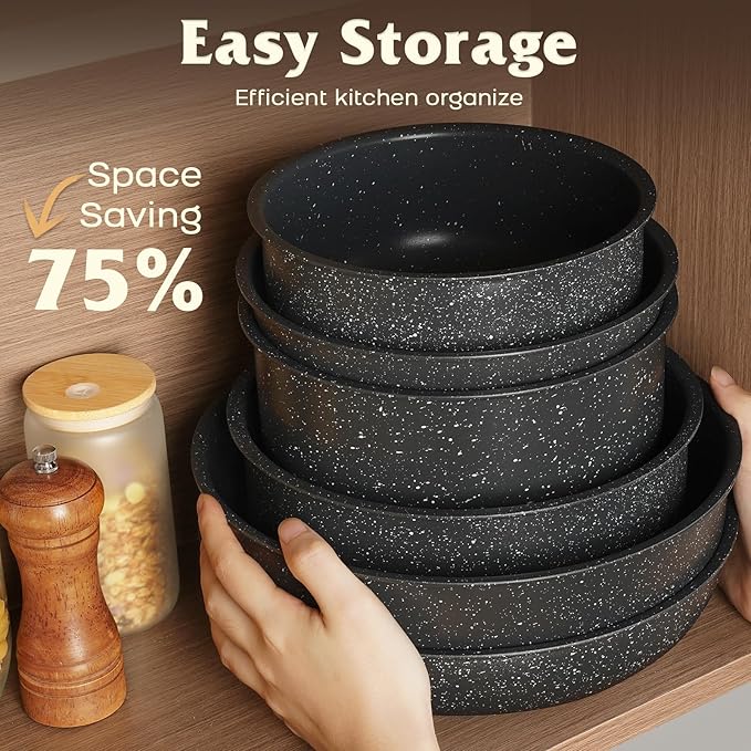 17 Pcs Pots and Pans Set Non Stick, Cookware Sets with Detachable Handle, Nonstick RV Kitchen Cooking Tools Removable Handles, Oven Safe, Induction Fast, Stackable Induction Cookware, Black