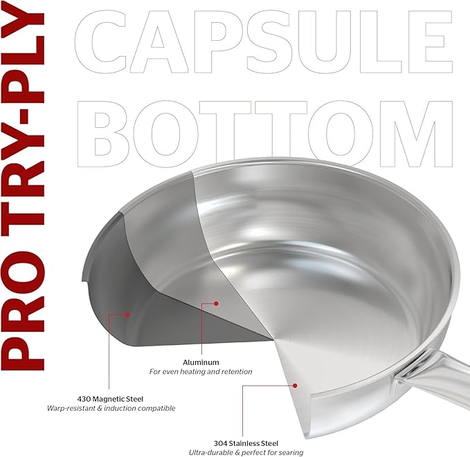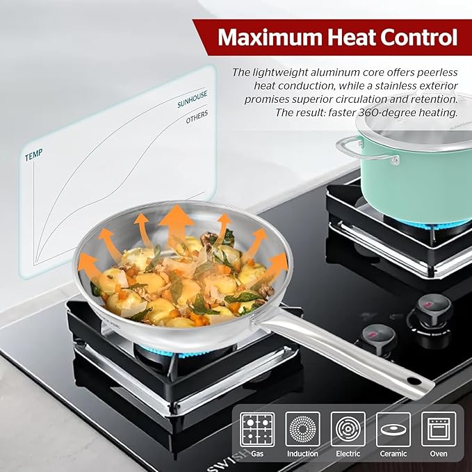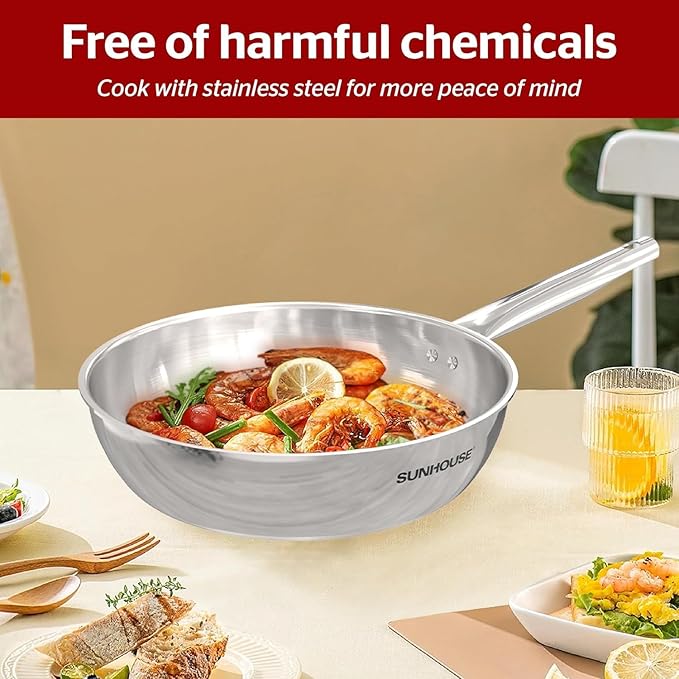 Sunhouse 8 Inch Tri-Ply Stainless Steel Frying Pan, Whole-Clad No Coatings Skillet with Stay-cool Handle for Cooking, Durable & Oven Safe to 500°F, Dishwasher Safe, Compatible with All Cooktops
