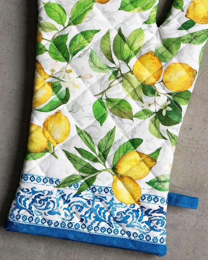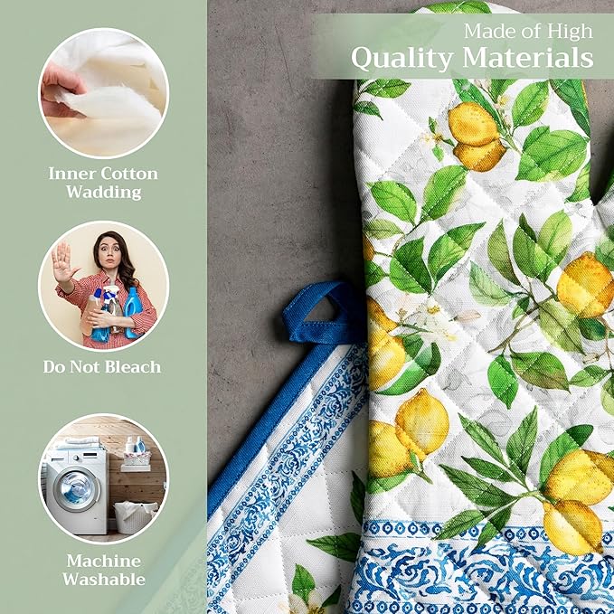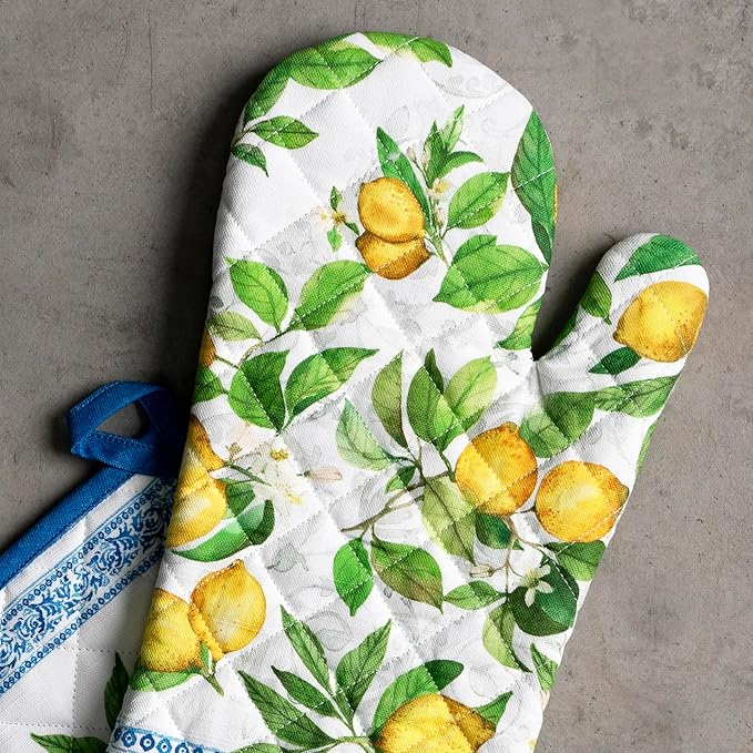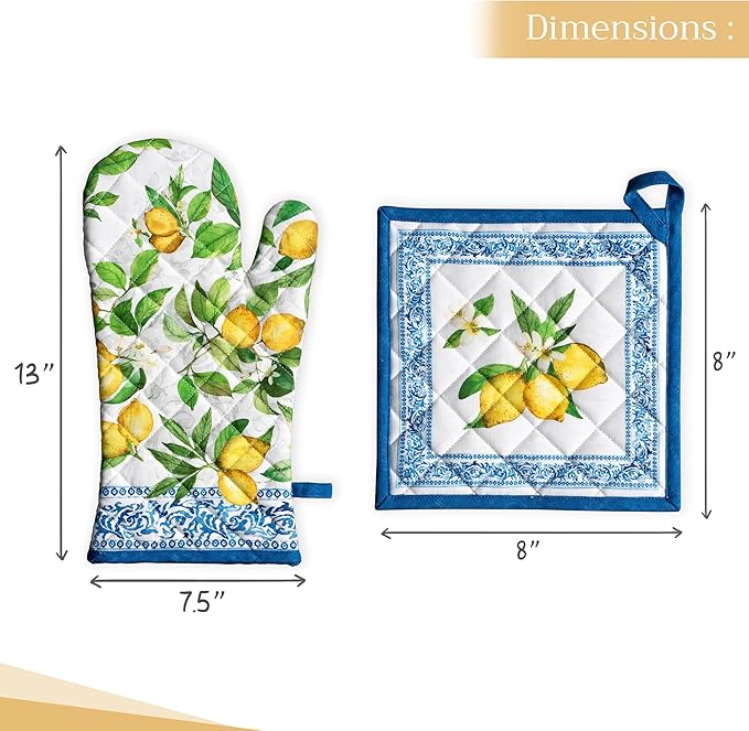Maison d' Hermine 100% Cotton Oven Mitt & Pot Holder Set (7.5"x13" & 8"x8") Heat Resistant BBQ Cooking Gloves with Loop, Baking, Grilling, Kitchen, Handling Hot Pans Spring/Summer (Cedrat)