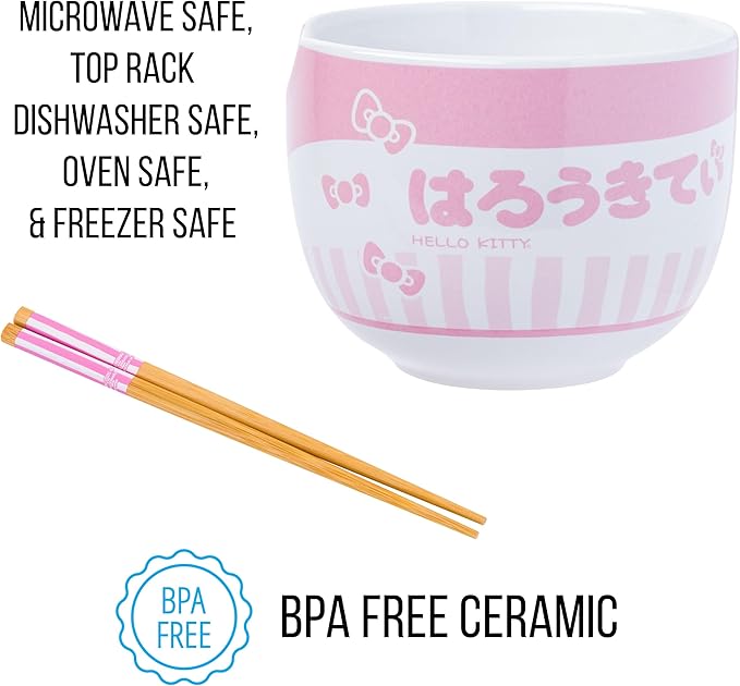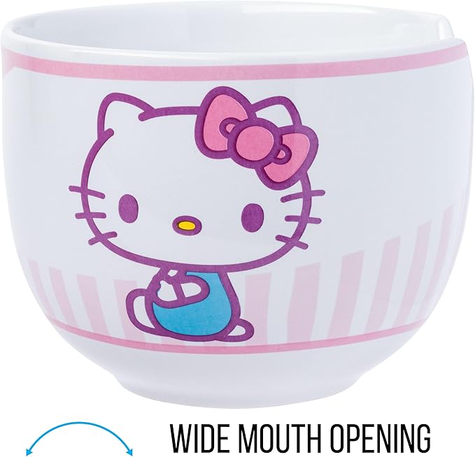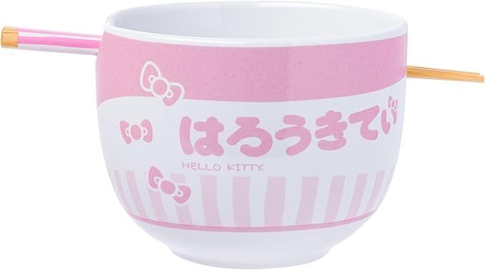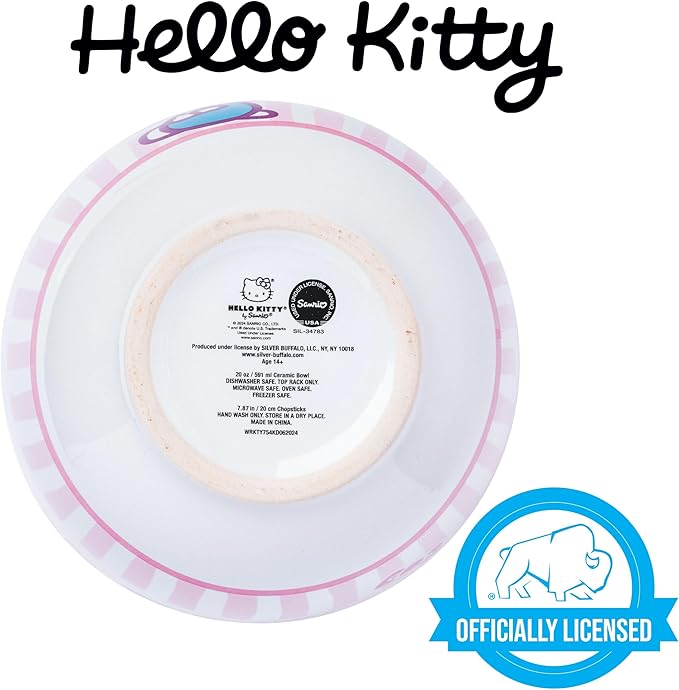 Silver Buffalo Sanrio Hello Kitty Pink Stripes Ceramic Ramen Bowl with Chopsticks, 20 Ounces