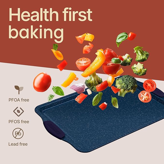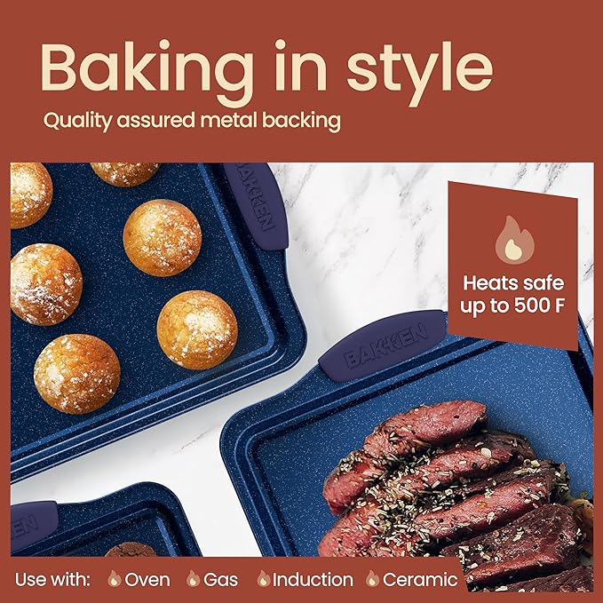 BAKKEN Kitchen Baking Pan Set - Nonstick Coating, Carbon Steel Bakeware Sets with Blue Silicone Handles, Baking Kitchen Essentials, PFOA, PFOS, PTFE Free, Oven Safe Tray (Up To 450° F), Set of 3