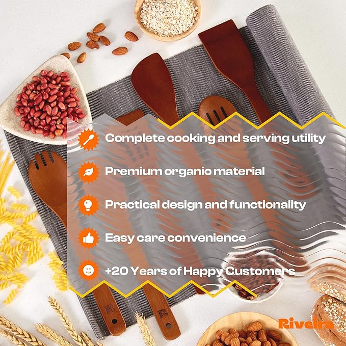 Riveira Premium Brown Bamboo Wooden Spoons for Cooking Set of 6 – Premium Brown Bamboo Wooden Cooking Utensils, Wooden Spatula, Wooden Spoon - Premium Quality Wooden Utensil Set for Non-Toxic Cooking