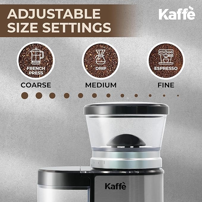 Kaffe Electric Burr Coffee Grinder (5.5oz) w/Adjustable Precise Coarseness Settings - Flat Burr - [Improved Motor] - Precision Coffee Bean Grinder for Home Use - Stainless Steel
