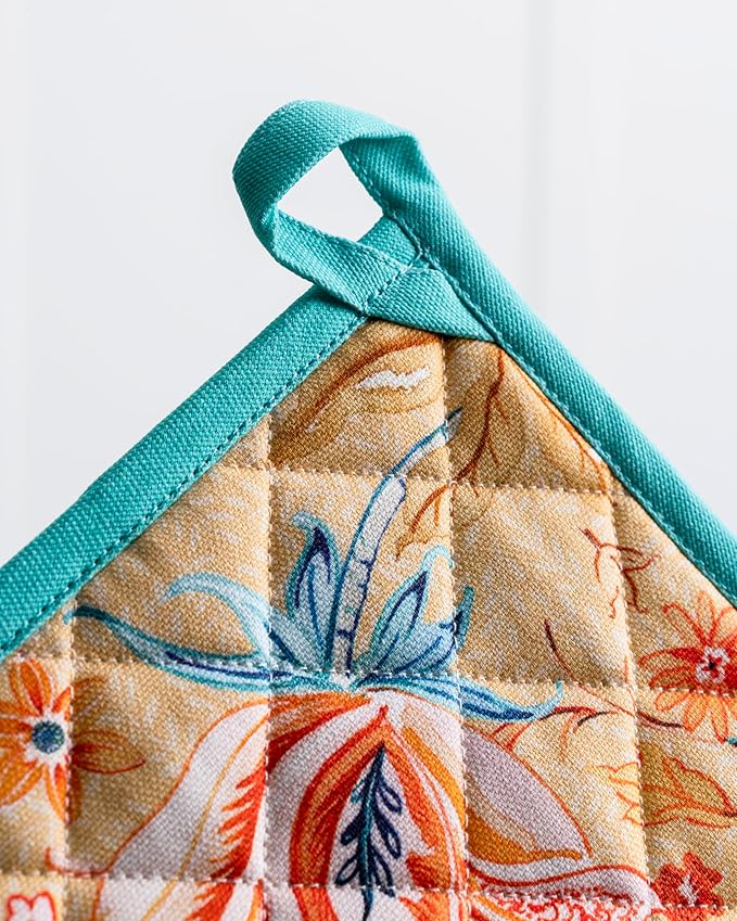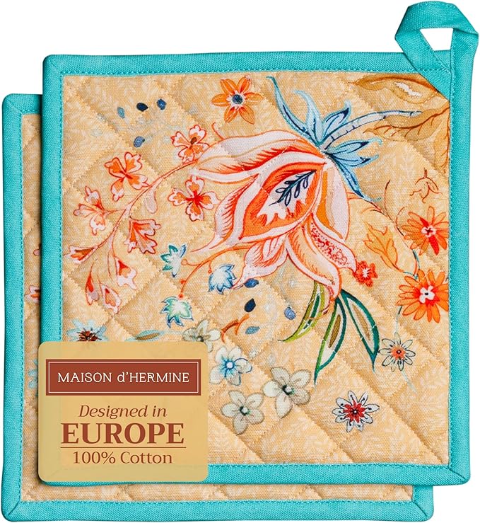 Maison d' Hermine Pot Holders Set 100% Cotton Heat Resistant Potholders 8" x 8" Hot Pads with Loop BBQ, Cooking, Grilling, Kitchen, Handling Hot Pans Spring/Summer (Pack of 2, Luxury Loft – Peach)