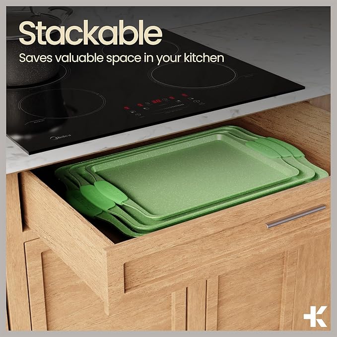 BAKKEN Kitchen Baking Pan Set - Nonstick Green Marble Coating, Carbon Steel Bakeware Sets with Green Silicone Handles, Kitchen Essentials, PFOA, PFOS, PTFE Free, Oven Safe (Up To 450° F), Set of 3