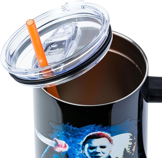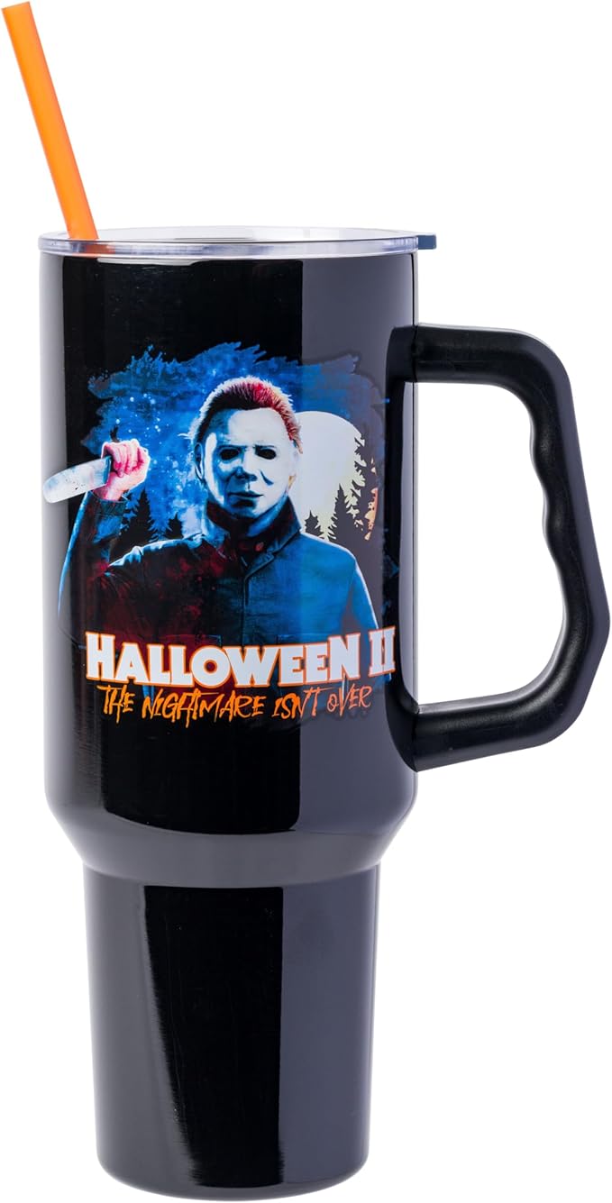 Silver Buffalo Halloween II “The Nightmare Isn’t Over” Stainless Steel Tumbler with Handle Featuring Michael Myers, Fits in Standard Cup Holder, 40 Ounces