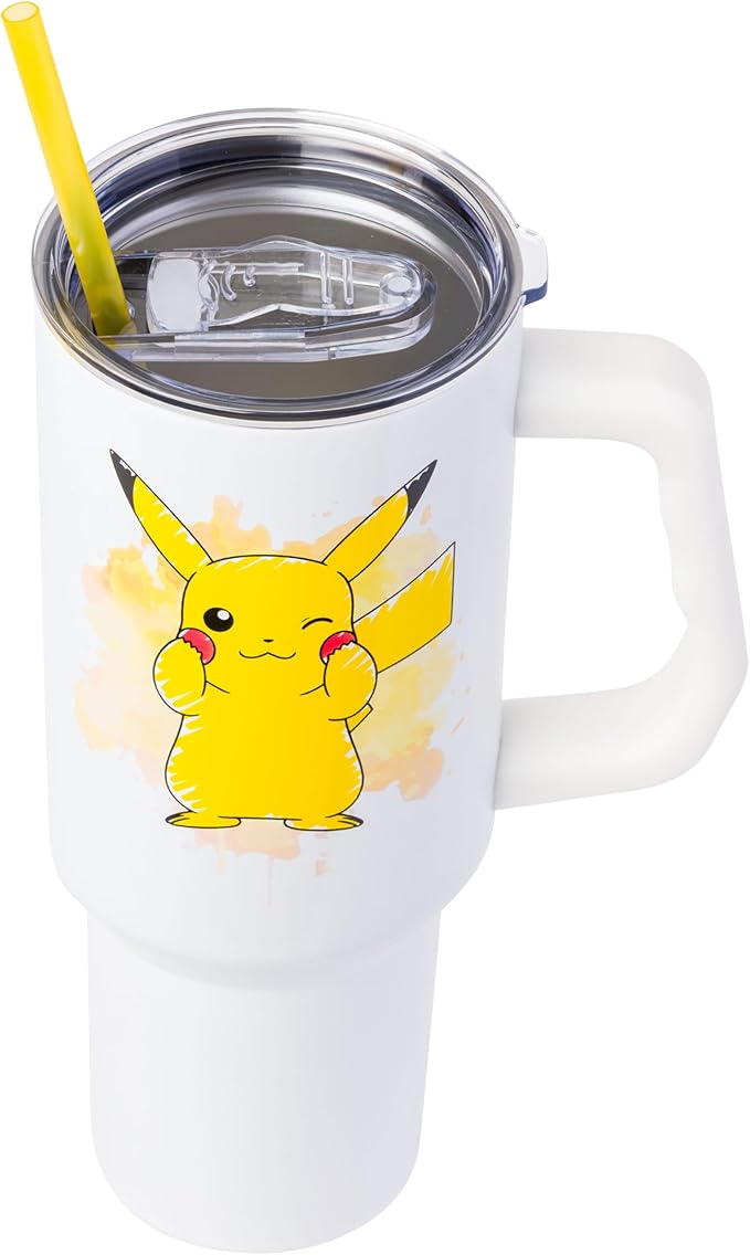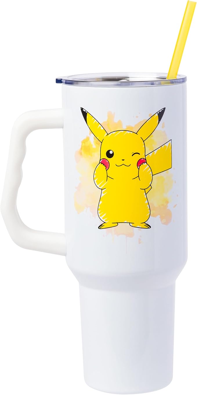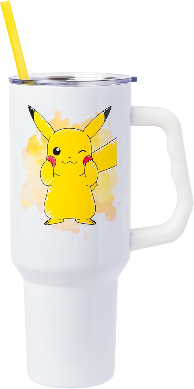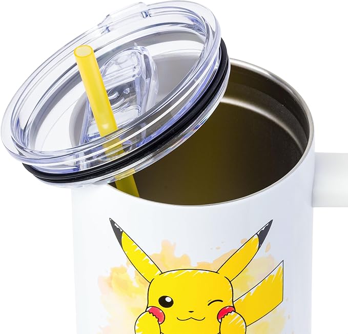 Silver Buffalo Pokémon Stainless Steel Tumbler with Handle Featuring Pikachu, Fits in Standard Cup Holder, 40 Ounces