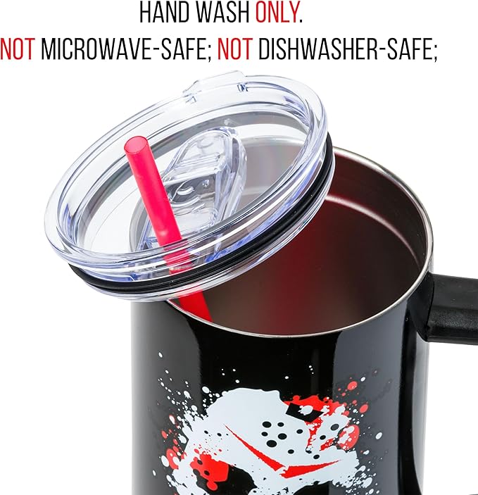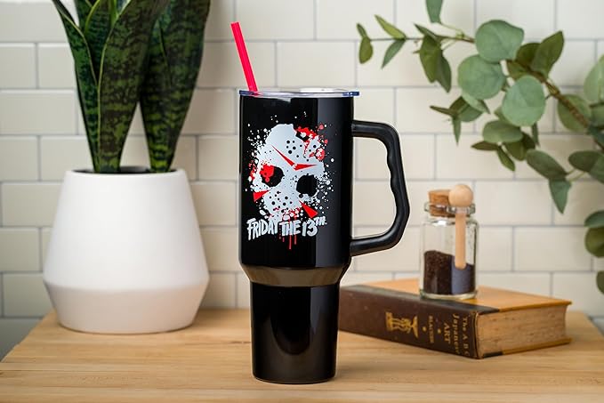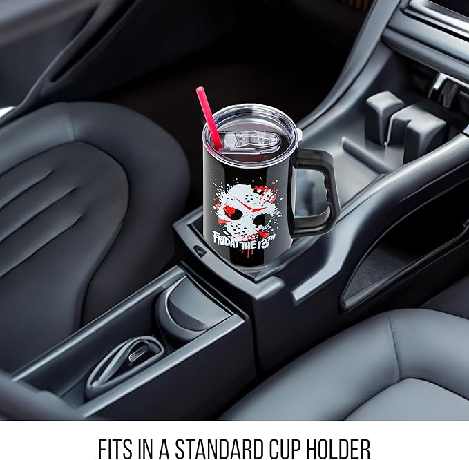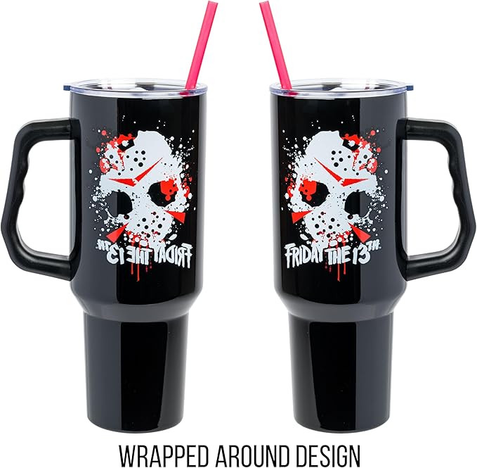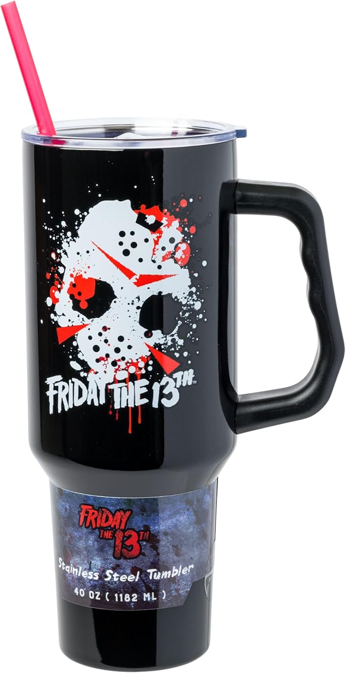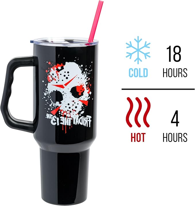 Silver Buffalo Friday The 13th Stainless Steel Tumbler with Handle Featuring Jason Voorhees’s Splatter Mask, Fits in Standard Cup Holder, 40 Ounces