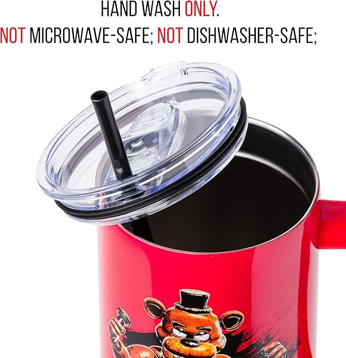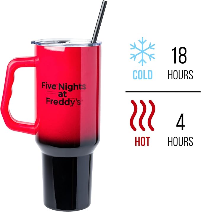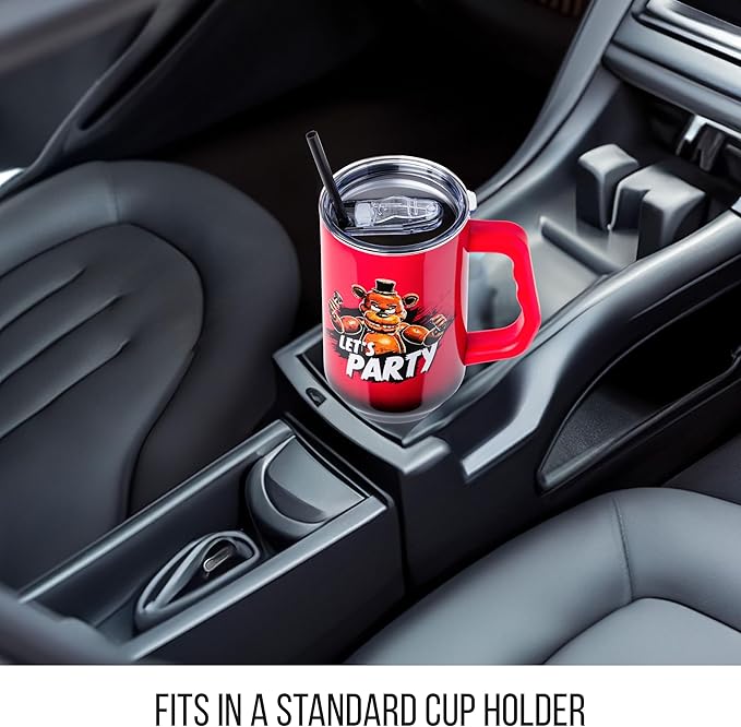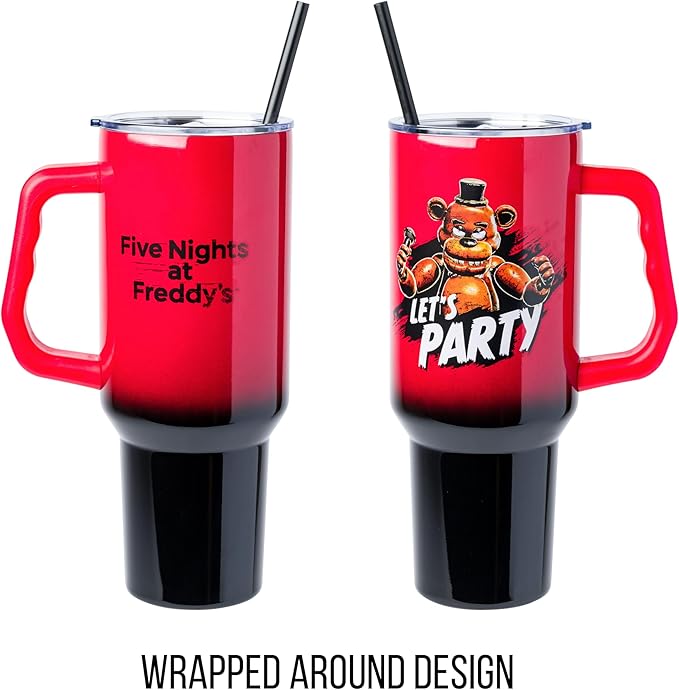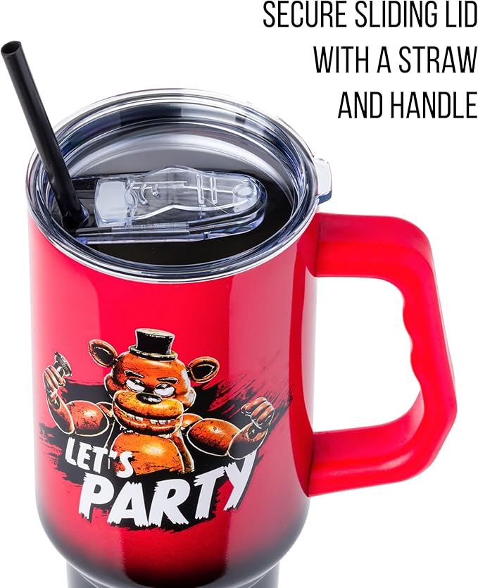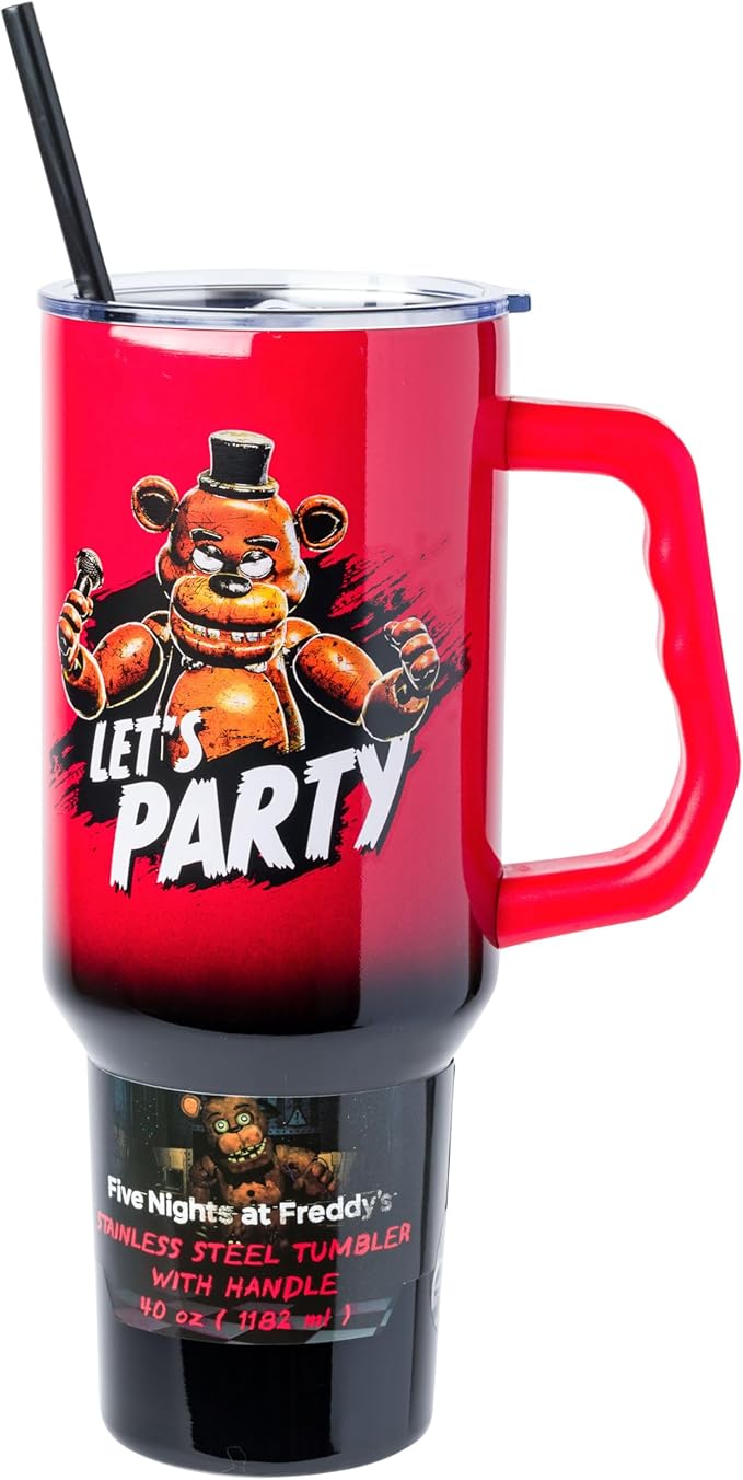 Silver Buffalo Five Nights At Freddy's “Let's Party” Stainless Steel Tumbler with Handle Featuring Freddy Fazbear, Fits in Standard Cup Holder, 40 Ounces