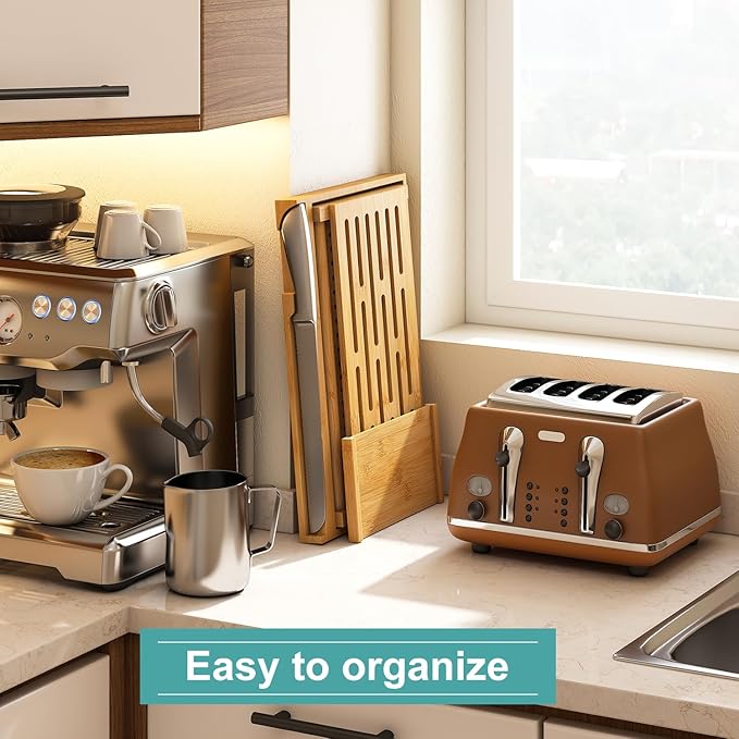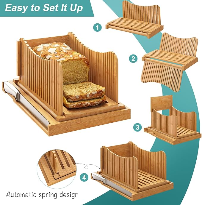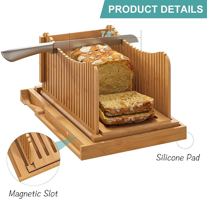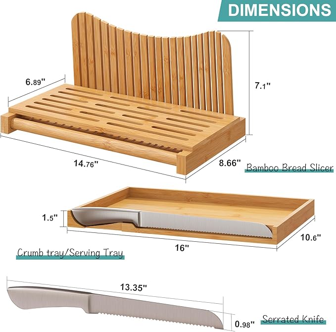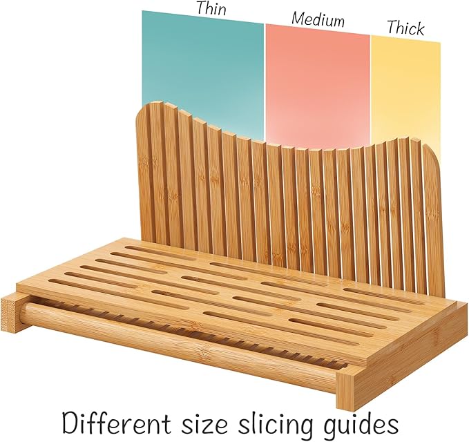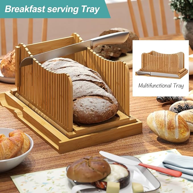Large Bamboo Bread Slicer with Serrated Knife, Adjustable Bread Slicer Guide with 3 Thickness Size, Foldable Compact Chopping Cutting Board with Crumb Tray (Extra A - with Knife)