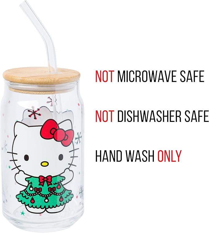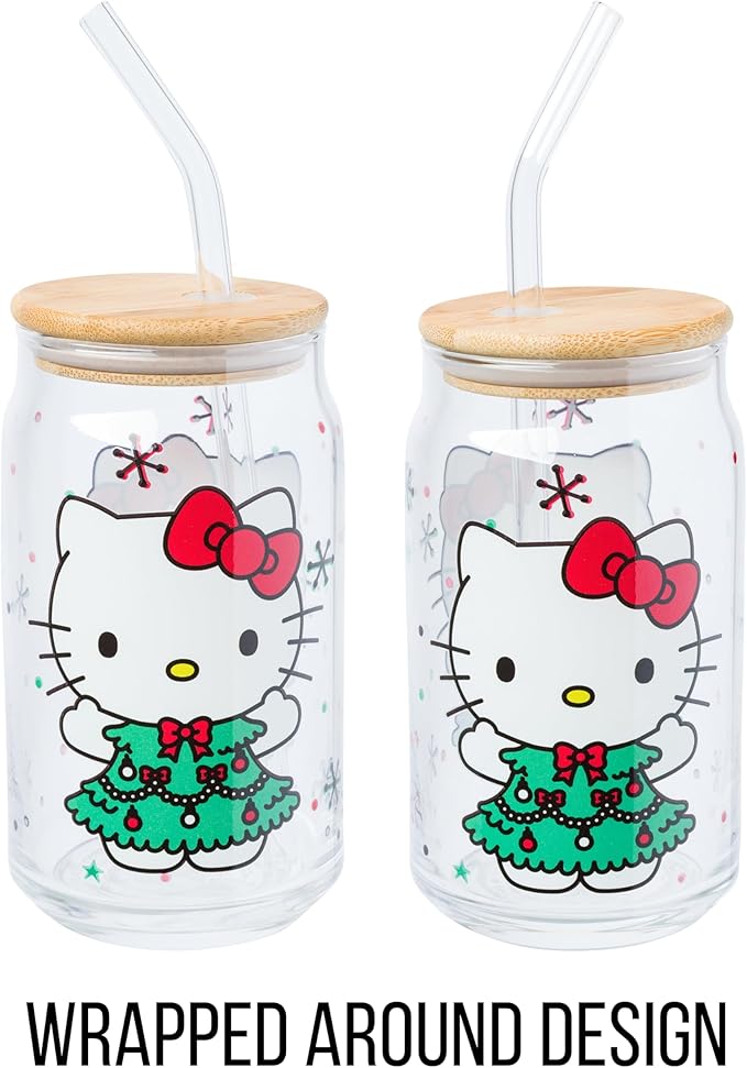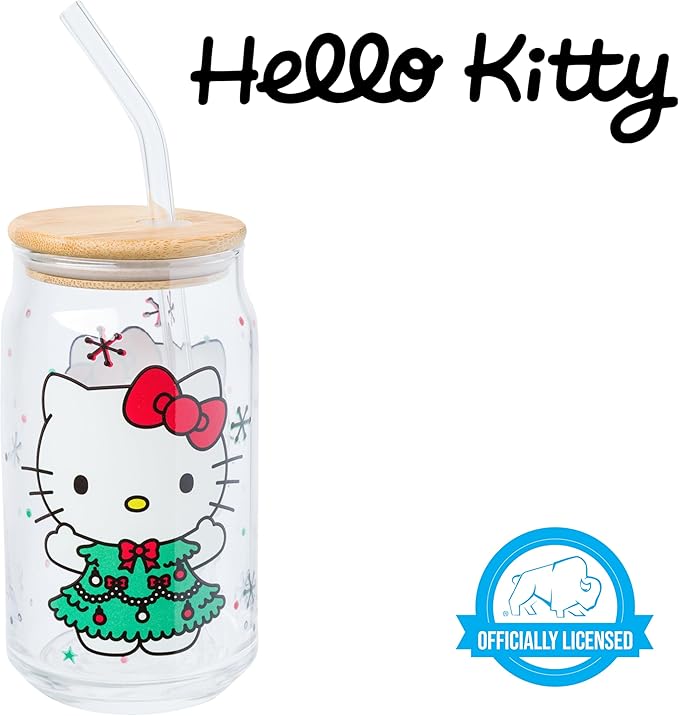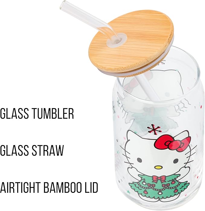 Silver Buffalo Sanrio Hello Kitty Holiday Glass Tumbler with Bamboo Lid and Glass Straw, 16 Ounces