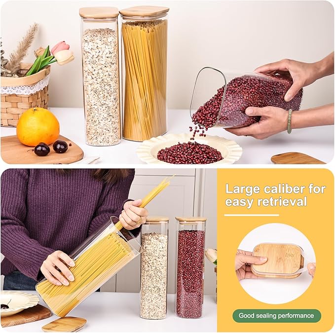 Liuruiyu Glass Storage Jars Set of 3, Clear Glass Food Storage Containers with Airtight Bamboo Lid Stackable Kitchen Canisters for Candy,Cookie,Rice,Sugar,Flour,Pasta(Flat)