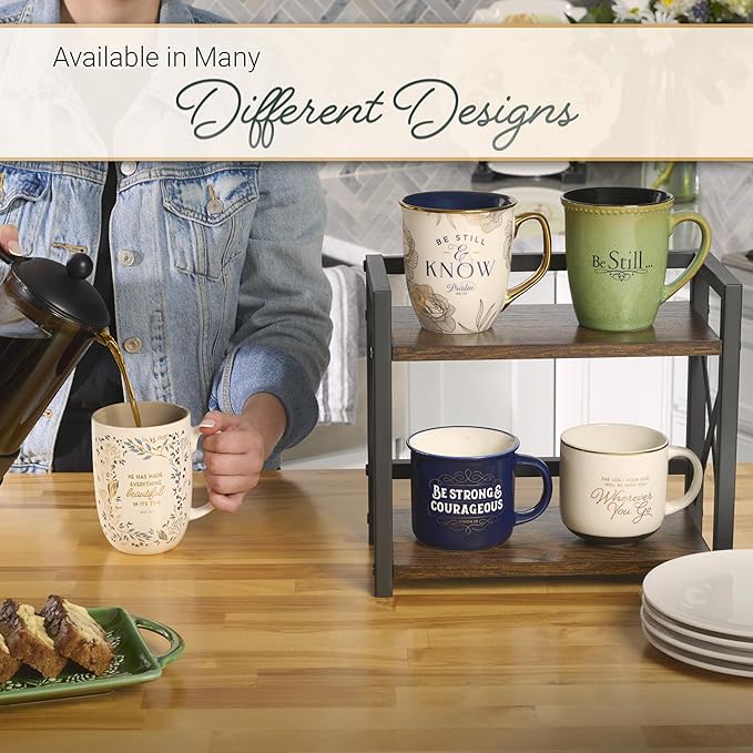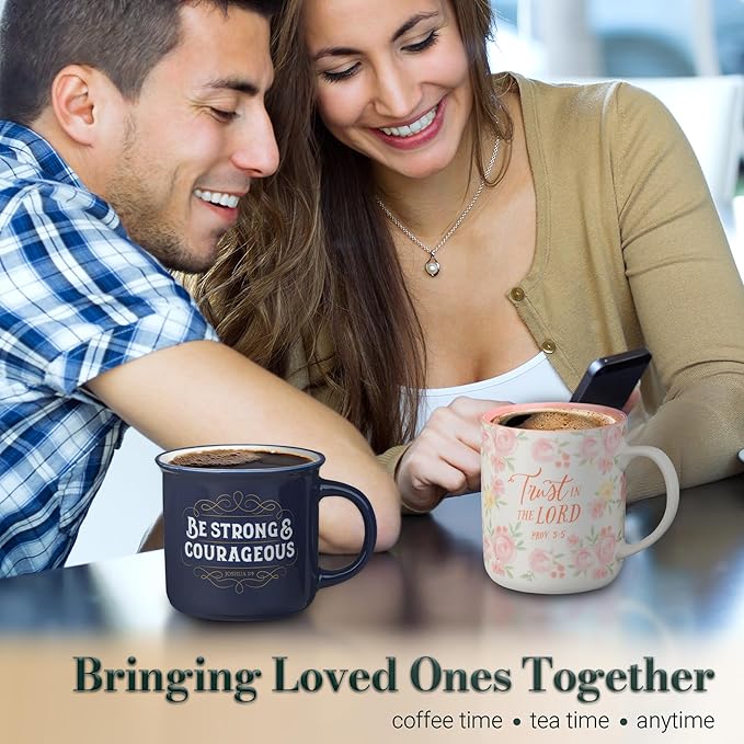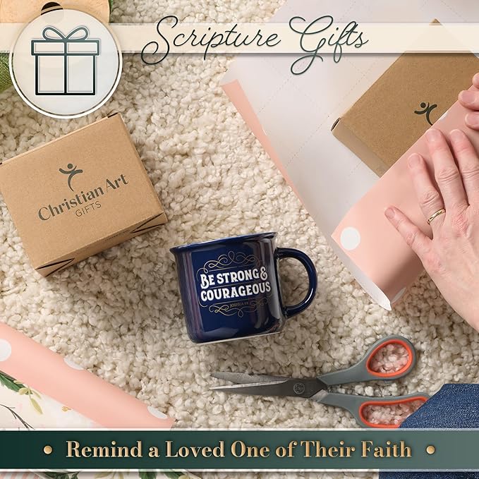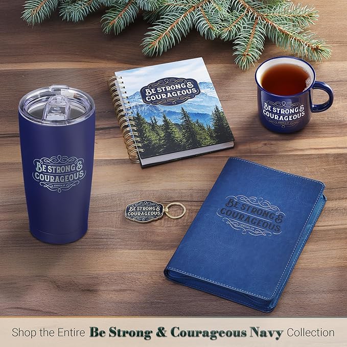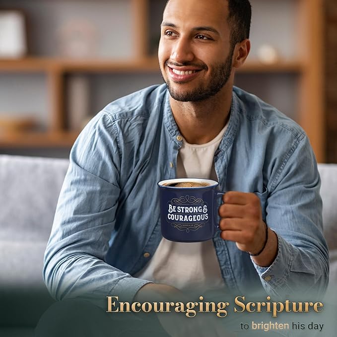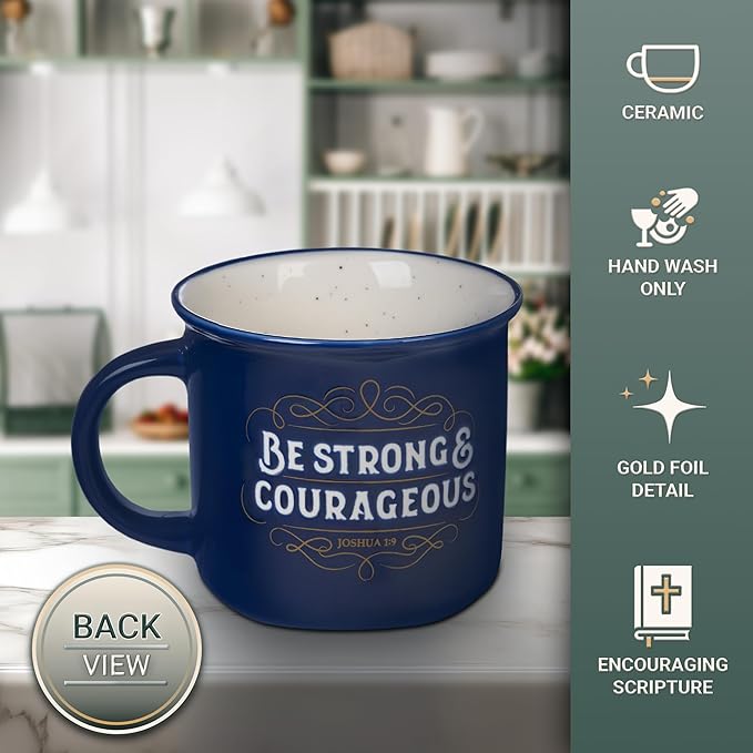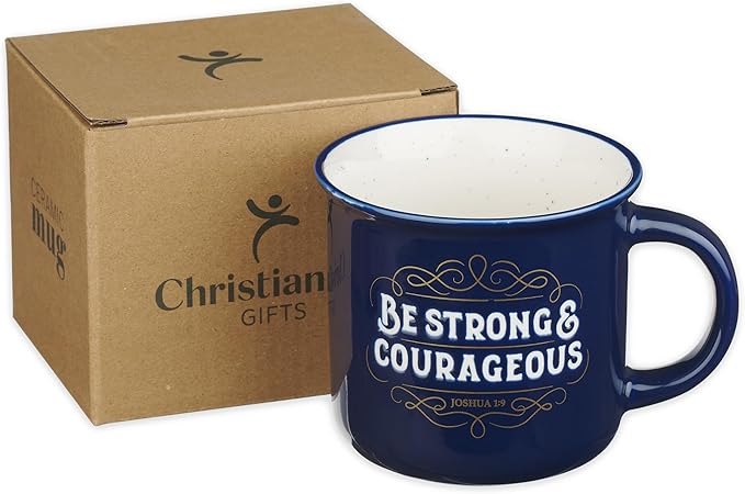Christian Art Gifts Inspirational Ceramic Coffee & Tea Scripture Mug for Men & Women: Strong & Courageous Bible Verse, Microwave & Dishwasher Safe Non-toxic Beverage Cup, Dark Navy Blue/White, 13 oz.