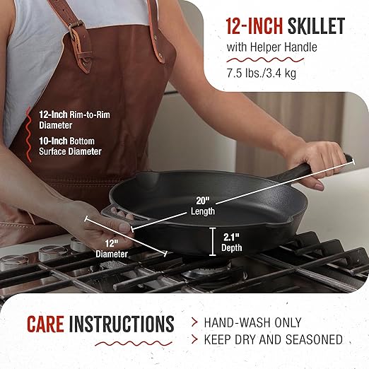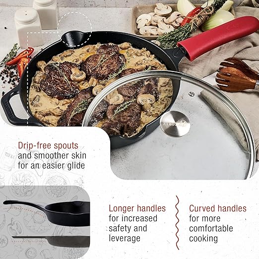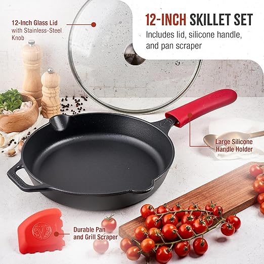 Victoria 12-Inch Cast Iron Skillet Set with Tempered Glass Lid, Large Handle Cover, and Pan Scraper