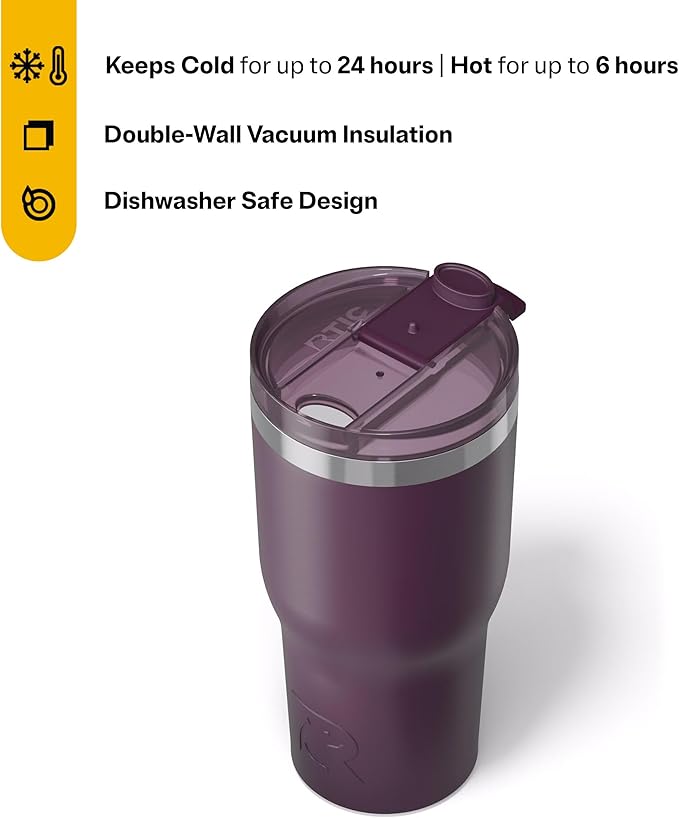 RTIC 30oz Essential Tumbler with Lid, Ceramic Lined, Insulated, Stainless Steel, Metal, Double Wall Vacuum-Insulation, Travel Cup for Iced Coffee, Tea, Hot and Cold Drink, Plum