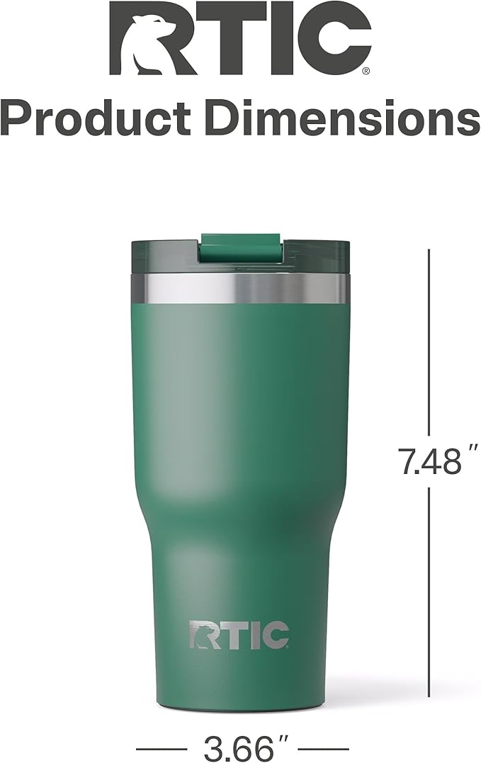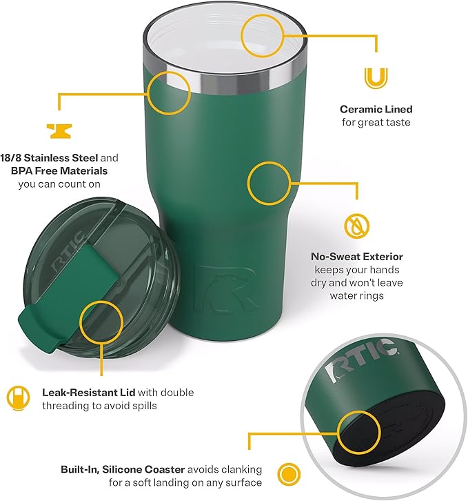 RTIC 20oz Essential Tumbler with Lid, Ceramic Lined, Insulated, Stainless Steel, Metal, Double Wall Vacuum-Insulation, Travel Cup for Iced Coffee, Tea, Hot and Cold Drink, Pine Tree