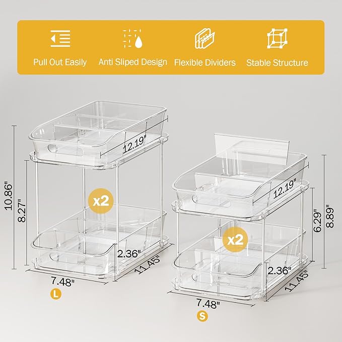 Delamu 2-Tier Under Sink Organizers and Storage, Multi-Purpose Stackable Bathroom Cabinet Organizers, Pull Out Kitchen Pantry Organization and Storage with Dividers(4 Pack, Clear)
