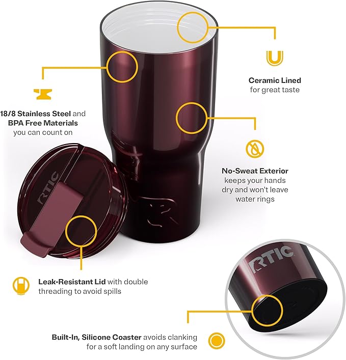 RTIC 30oz Essential Tumbler with Lid, Ceramic Lined, Insulated, Stainless Steel, Metal, Double Wall Vacuum-Insulation, Travel Cup for Iced Coffee, Tea, Hot and Cold Drink, Vintage Rose Metallic