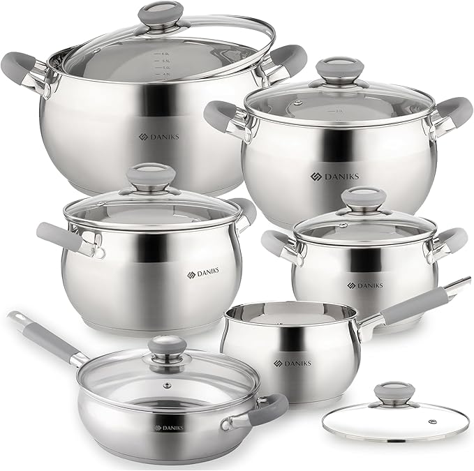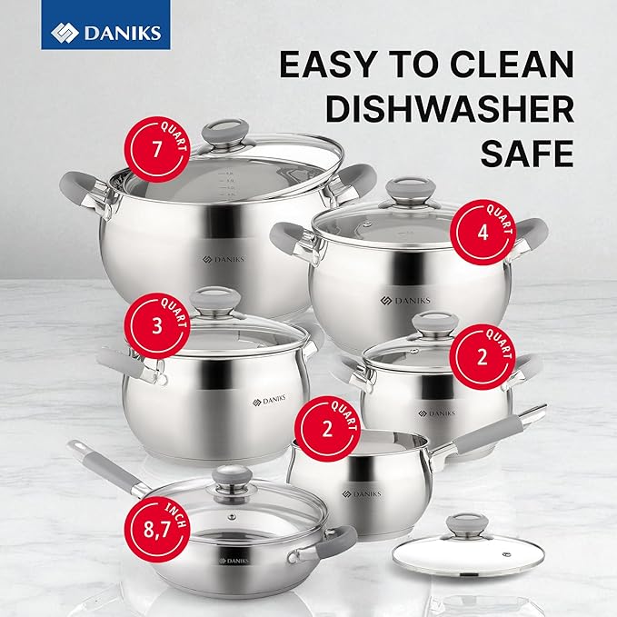 Daniks Modern 11-Piece Stainless Steel Induction Cookware Set – Dishwasher Safe Saucepan, Pots with Heatproof Handles, Glass Lids, Frying Pan with Lid, Silver