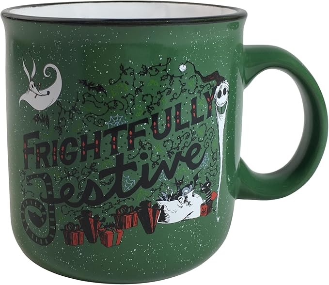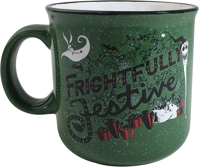 About This NIGHTMARE BEFORE CHRISTMAS: Themed mug features Jack Skellington and Zero with “Frightfully Festive” written between them. Presents, bats,... Read more