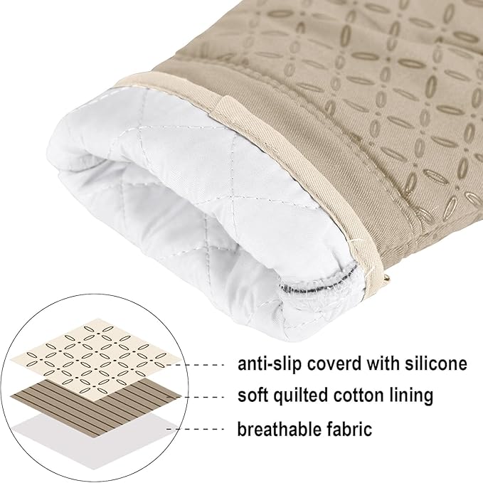 KEGOUU Oven Mitts and Pot Holders 6pcs Set, Kitchen Oven Glove High Heat Resistant 500 Degree Extra Long Oven Mitts and Potholder with Non-Slip Silicone Surface for Cooking (Almond)