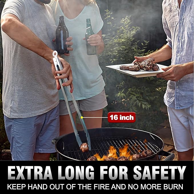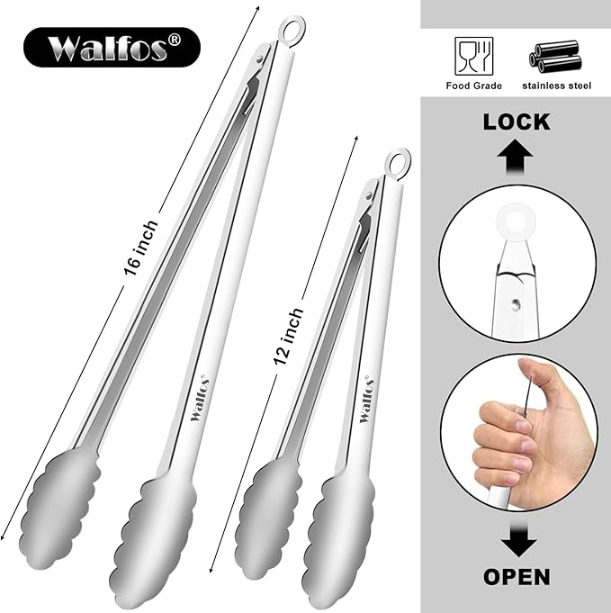 Tong for cooking, Walfos kitchen tongs set of 2 - Heat Resistant 600℉, Heavy Duty Locking Metal cooking Tongs, Stainless Steel BBQ Grilling,(All Metal 12in+16in)