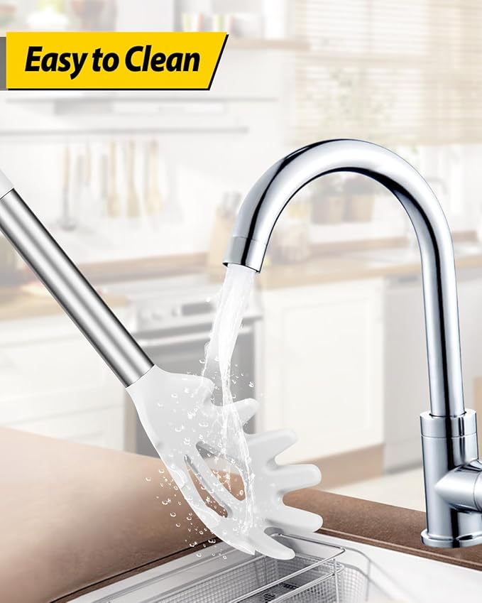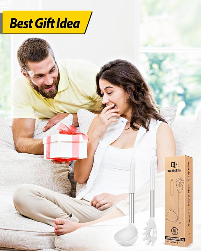 Silicone Pasta Fork and Ladle Spoon Set, Large Non Stick Kitchen Utensils for Cooking,Stirring,Serving Spaghetti, Soup, Sauce (WHITE)