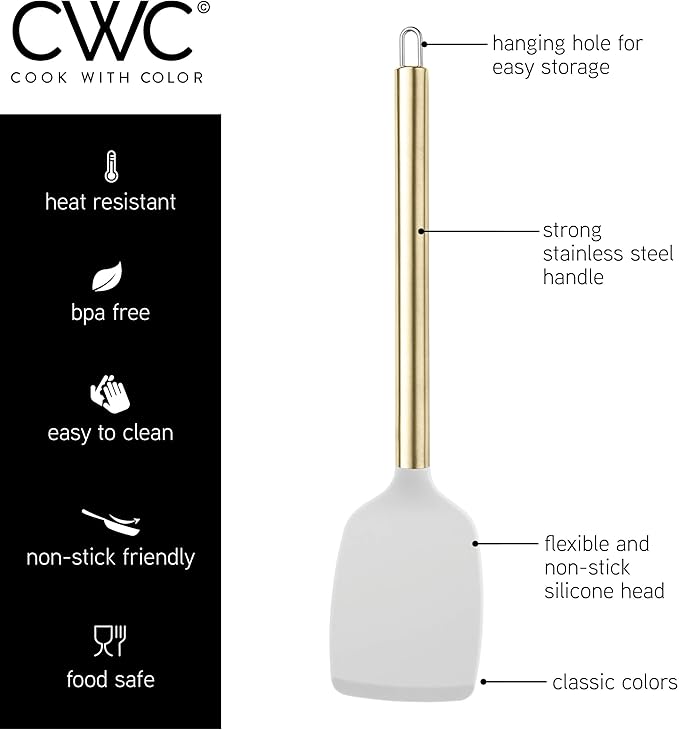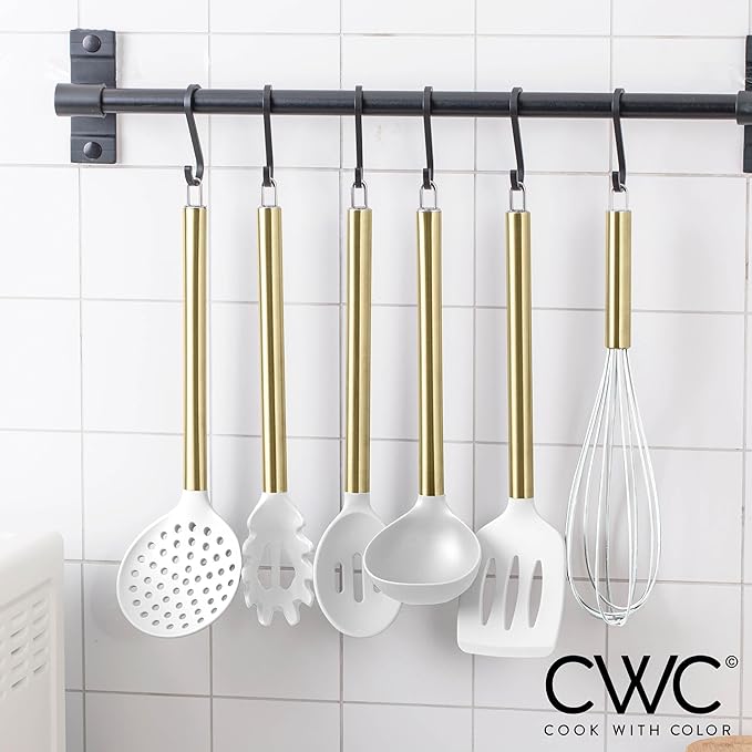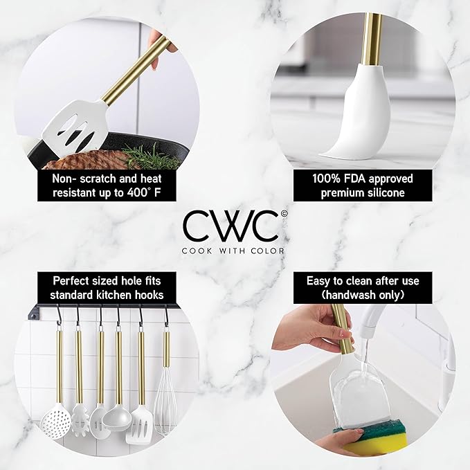 • Gold utensil set with metallic tones, this set of silicone kitchen tools has an up to date, trendy look that is madly in line with the current styles and trends. Add a splash of color and funk to your kitchen and hang from the rings on each utensil.