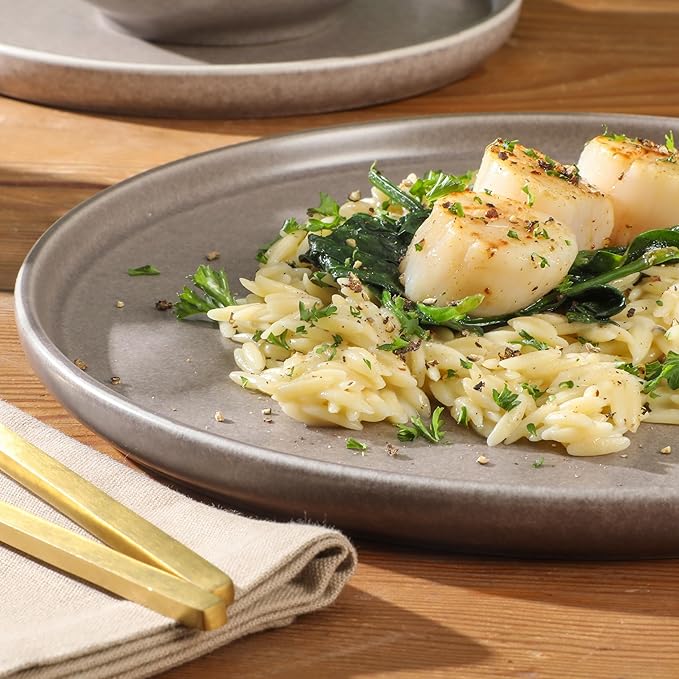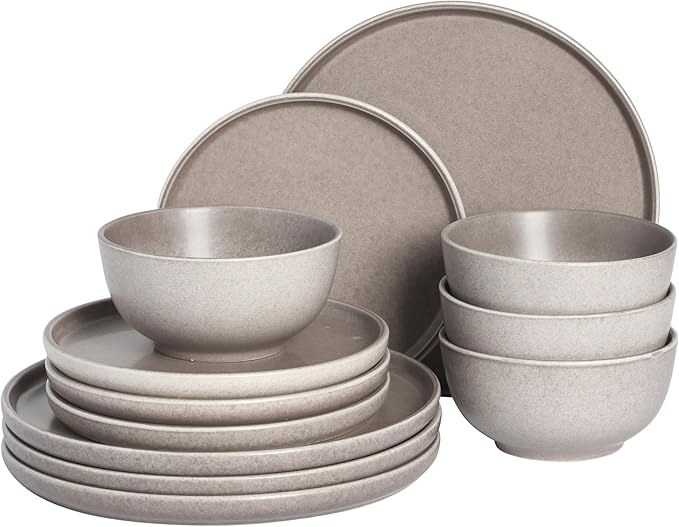 Gibson Elite 12 Piece (Service for 4) Eden Rock Plates and Bowls Reactive Glaze Round Dishes Stoneware Ceramic Dinnerware Set - Grey