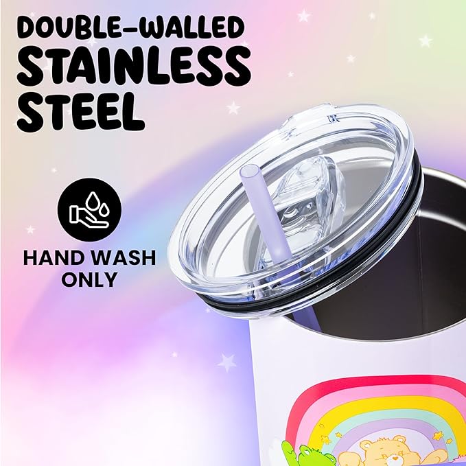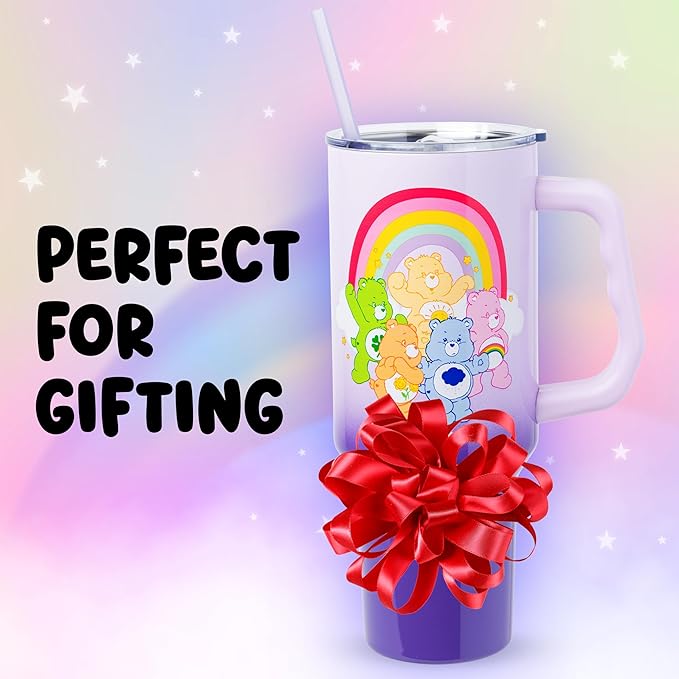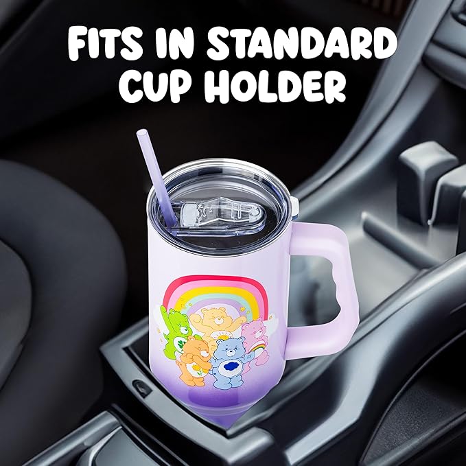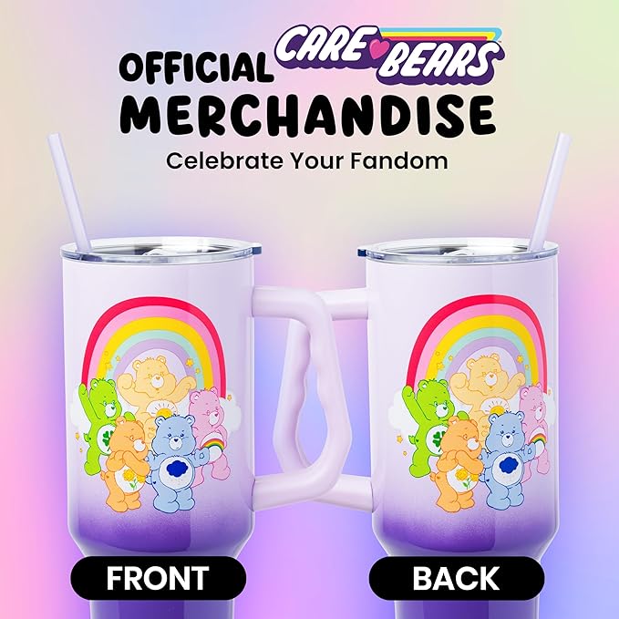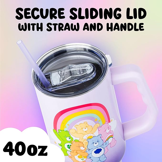 Silver Buffalo Care Bears Rainbow Featuring Funshine, Cheer, Grumpy, Friend, and Good Luck Bear Stainless Steel Tumbler with Handle and Straw, Fits in Standard Cup Holder, 40 Ounces