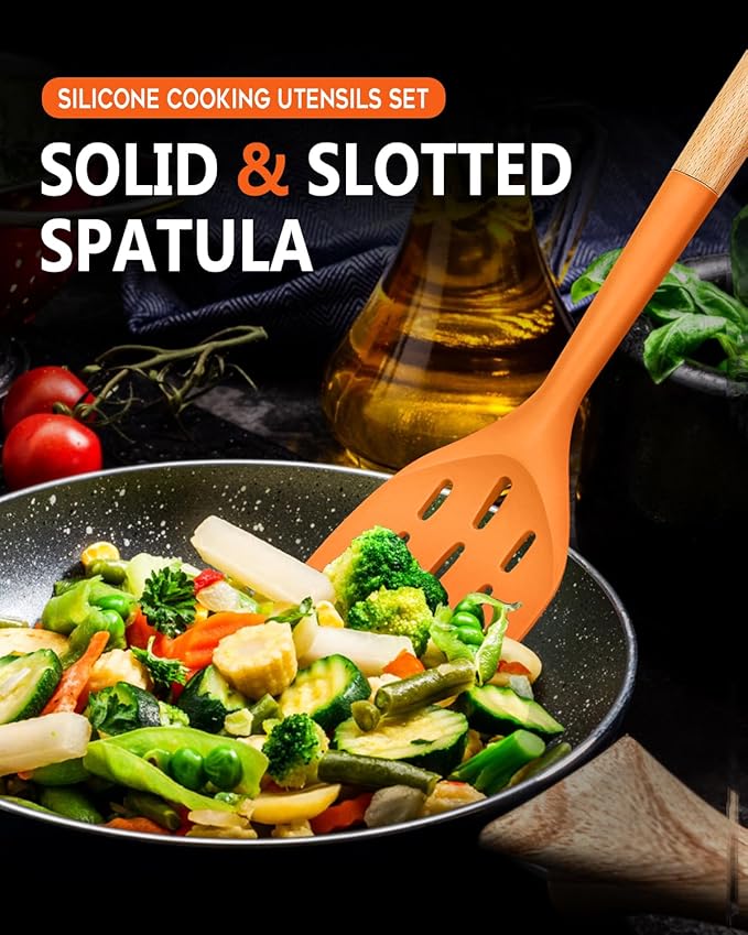 Pack of 2 Silicone Spatula, Non Stick Cooking Utensil Set, Wooden Handle Kitchen Turner for Baking Mixing Grilling Serving Food Heat Resistant (ORANGE)