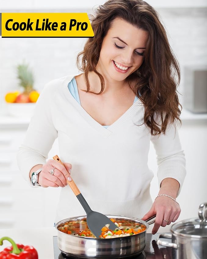 Pack of 4 Silicone Cooking Utensils Set, Non Stick Solid Spatulas and Heat Resistant Slotted Spoons with Wooden Handle, Ideal Wood Kitchen Utensils Set for Frying,Serving,Turning,Stirring (GRAY)
