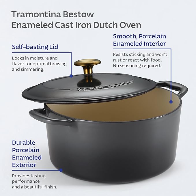 Tramontina Bestow Enameled Cast Iron Dutch Oven Pot with Lid, Round 5.5-quart, Smoke (Gold Knob)