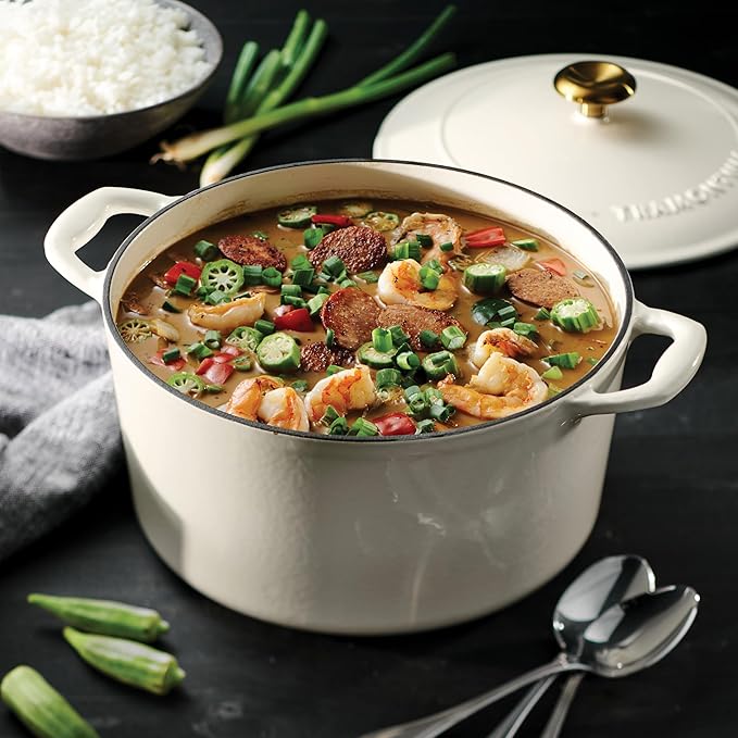 Tramontina Bestow Enameled Cast Iron Dutch Oven Pot with Lid, Round 6.5-quart, Latte (Gold Knob)
